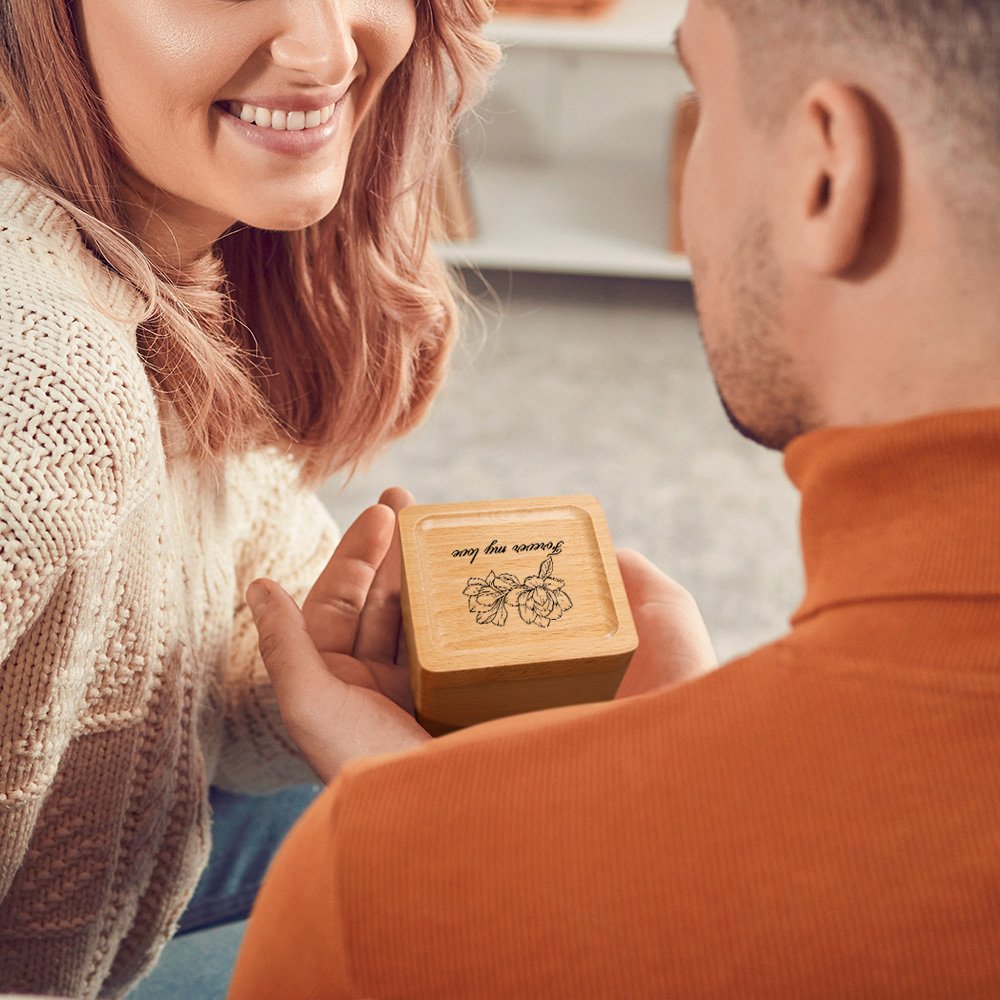 Le modèle présente une boîte en bois joliment travaillée, à la finition lisse, qui lui confère un aspect rustique mais élégant. Le couvercle de la boîte est orné d'un texte floral délicat, qui ajoute une touche de charme et de sentimentalité. Vous pouvez faire graver un message spécial ou le nom du destinataire sur la boîte, ajoutant ainsi une touche personnelle qui montre que vous avez pensé et pris soin de ce cadeau.
