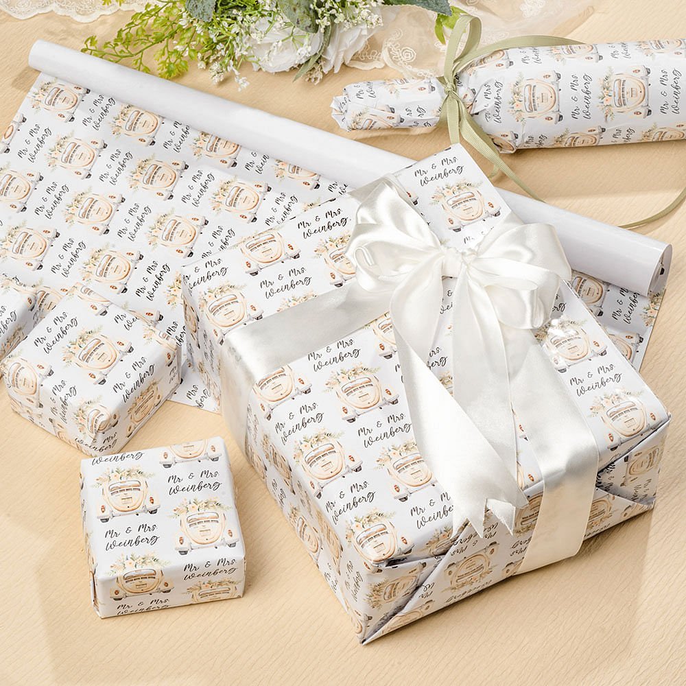 Ce papier d'emballage mat est magnifiquement conçu avec un imprimé de voiture de mariage de style vintage et décoré d'éléments floraux. Vous pouvez également personnaliser le texte sur le papier d'emballage pour le rendre plus chaleureux et romantique.