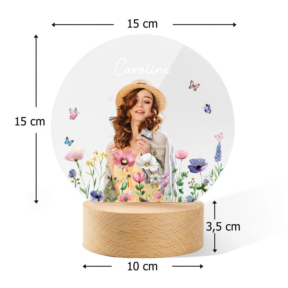 Vous pouvez créer une veilleuse unique en son genre en choisissant parmi quatre délicats motifs floraux à l'aquarelle, en téléchargeant une photo claire sur la face avant et en ajoutant un nom personnalisé ou un message sincère. Le motif mélange votre photo personnelle avec des fleurs sauvages vibrantes et des papillons qui voltigent, transformant une simple veilleuse en un hommage profondément personnel.