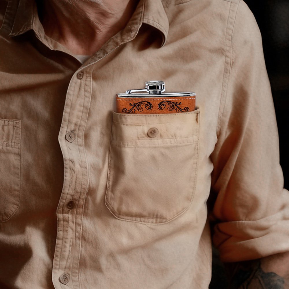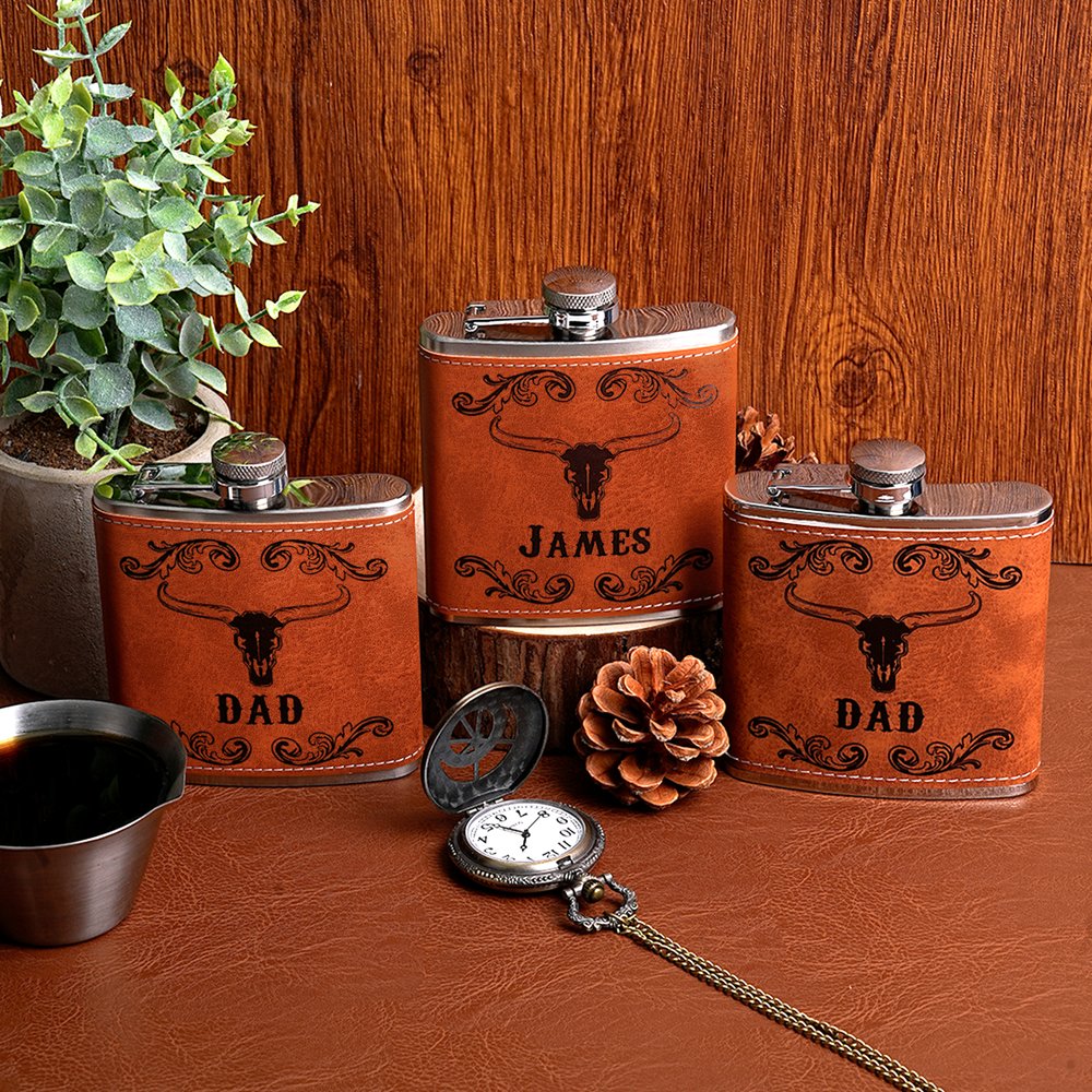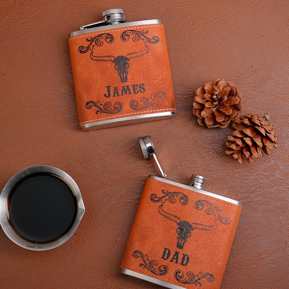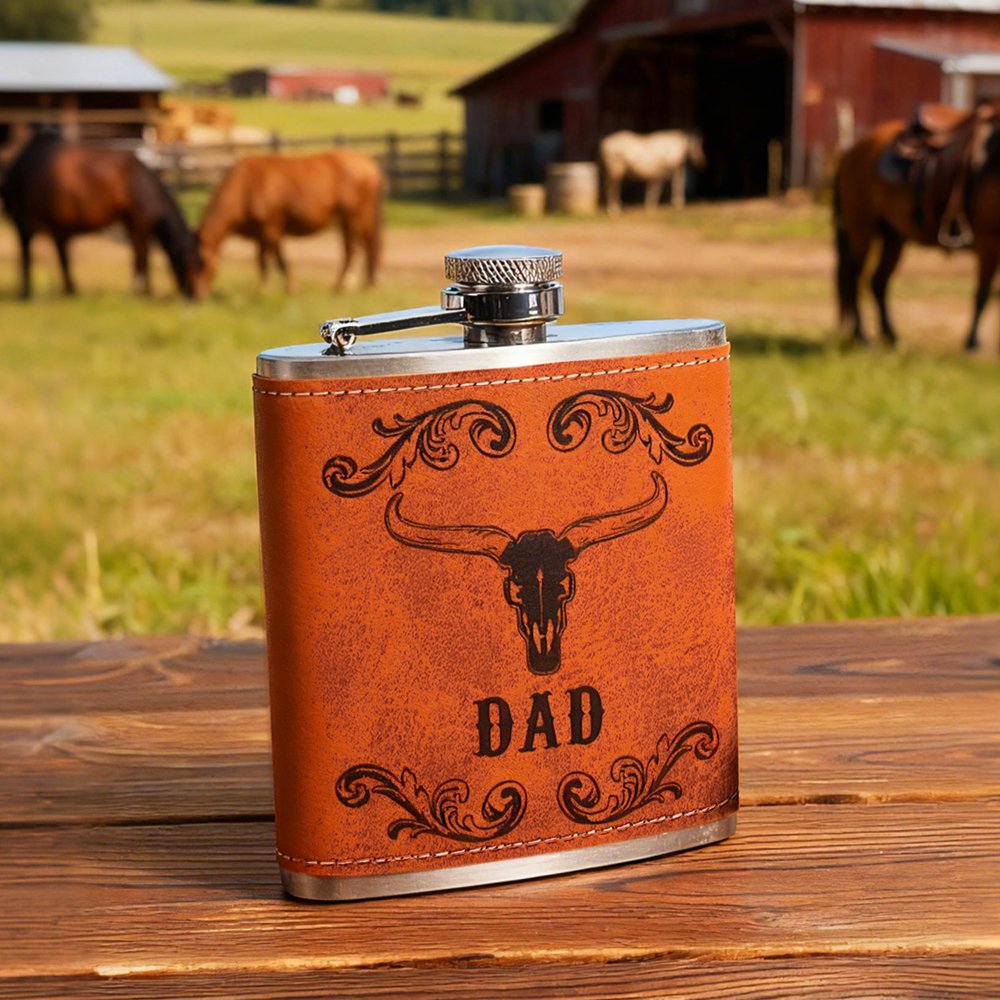 Cette flasque élégante présente un design western distinctif - un motif de crâne de longhorn associé à des volutes florales vintage - ainsi qu'un nom personnalisable pour ajouter une signification personnelle. Elle allie un style cow-boy robuste à une personnalisation sentimentale, transformant une flasque de base en un hommage unique à la culture occidentale.