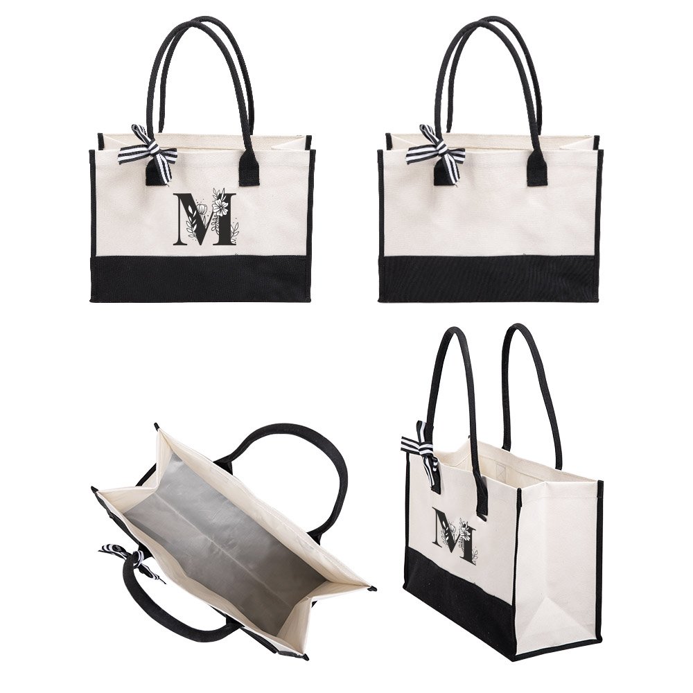 Le sac utilise deux couleurs principales, le noir et le blanc, ce qui le rend simple et charmant. Le centre du sac peut être personnalisé avec votre initiale, ce qui ajoute un cachet unique au sac. Le motif floral à côté des lettres apporte la touche finale au design simple et rend le design du sac plus élégant.