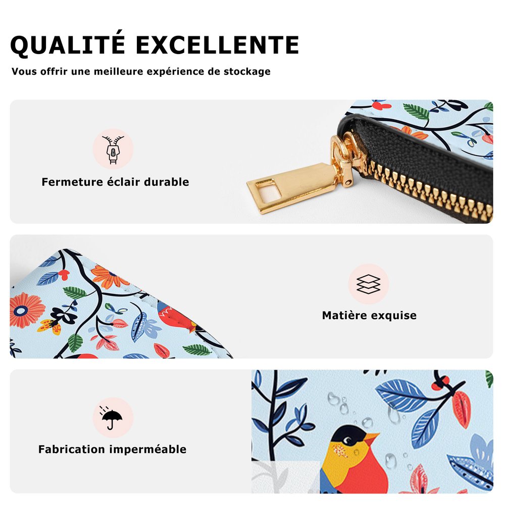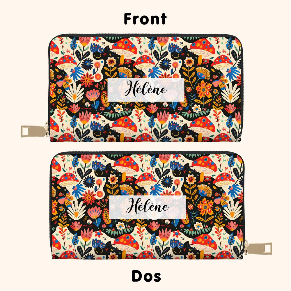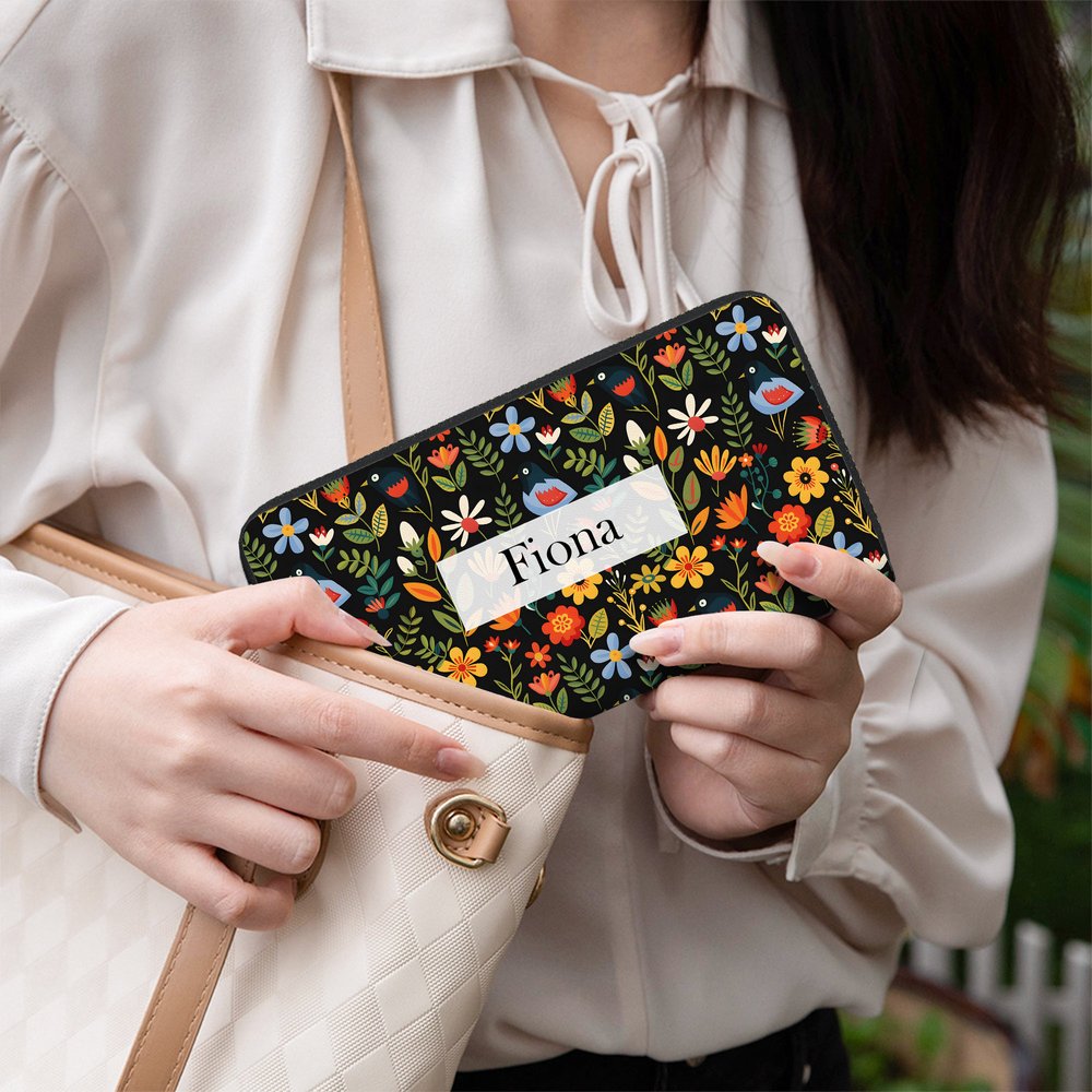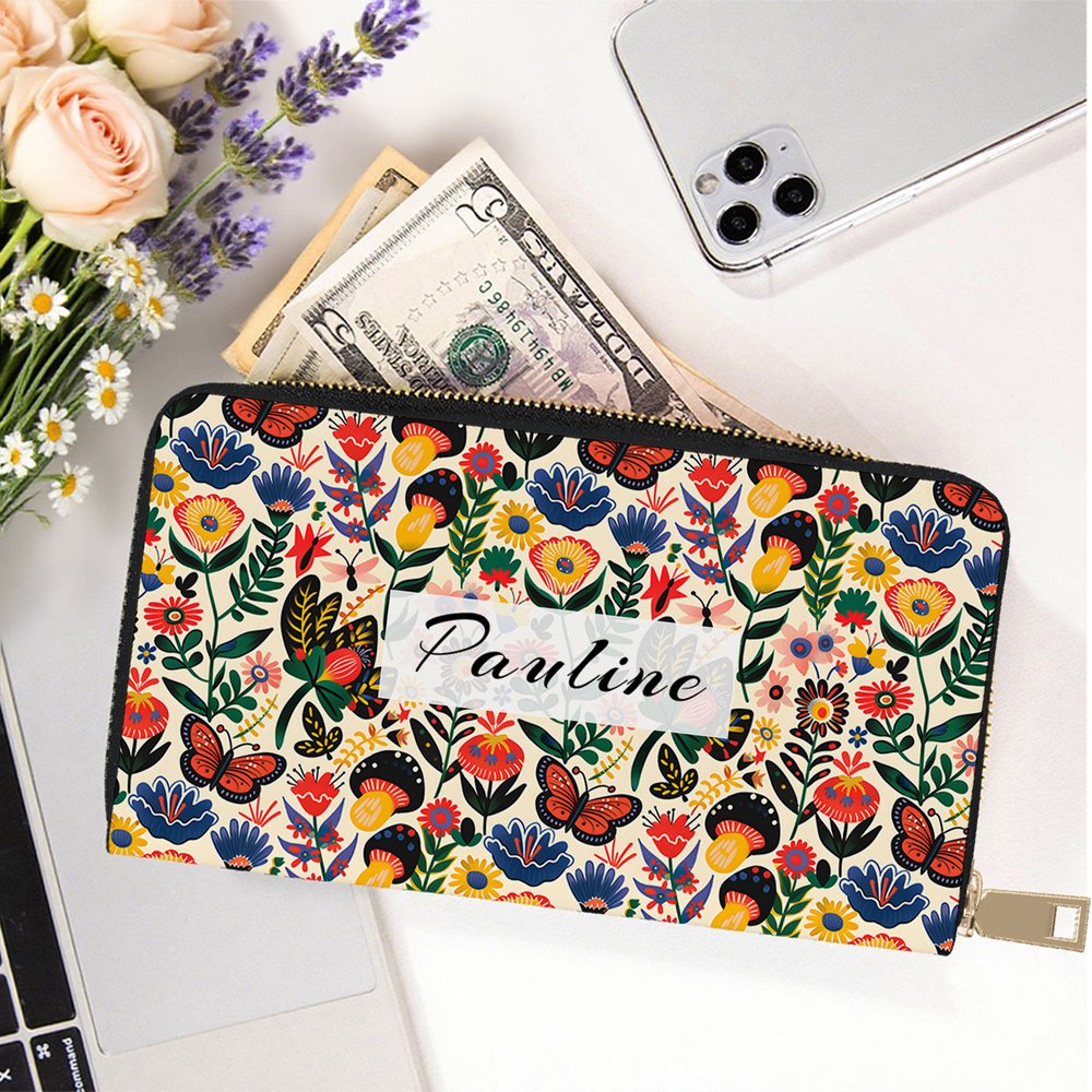 Ce portefeuille pour femme est recouvert de motifs floraux de style art populaire sur la surface, comme s'il capturait l'essence du paysage rural sur le portefeuille. Le corps du portefeuille peut être personnalisé avec un nom, faisant de l'art populaire un point de mire visuel et ajoutant un sentiment d'exclusivité dans l'utilisation quotidienne.