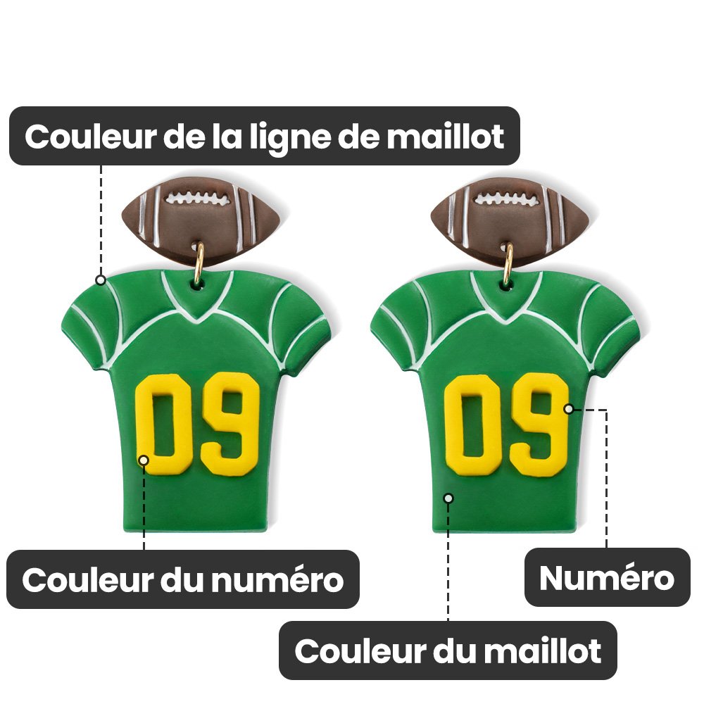 Le design général est celui d'un maillot. Vous pouvez utiliser la couleur de l'uniforme ou des encouragements de votre équipe préférée comme couleur des boucles d'oreilles, et le numéro de l'équipe ou du joueur préféré comme numéro sur les boucles d'oreilles. Le style sportif rend les boucles d'oreilles à la mode, distinctives et attrayantes.