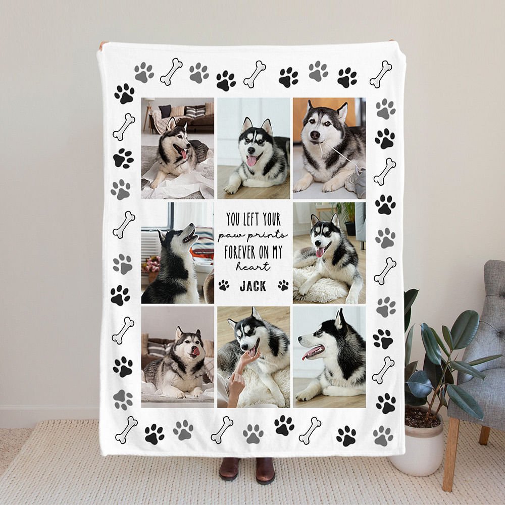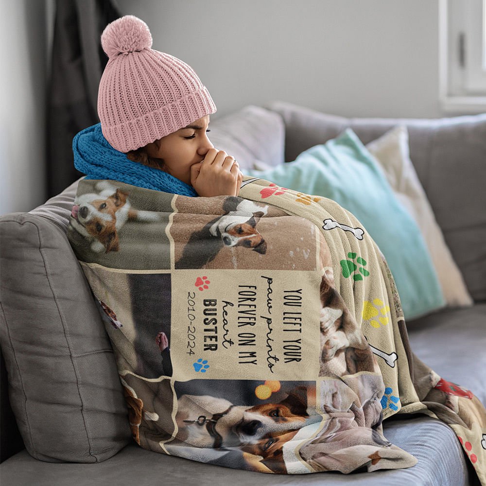 Le message "Plus à mes côtés, mais pour toujours dans mon cœur" ou "Tu as laissé l'empreinte de ta patte pour toujours sur mon cœur" qui orne le centre de la couverture est un rappel tendre et poignant du lien irremplaçable que vous partagiez avec votre animal de compagnie. Ce texte déchirant mais significatif, associé aux détails personnalisés, transforme cette couverture en un hommage profondément personnel et émouvant qui apportera réconfort et consolation pendant le deuil.