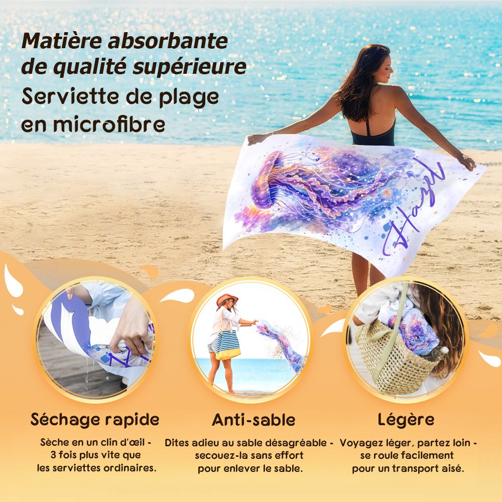Avec une aquarelle de vie marine comme motif principal, cette serviette de plage arbore un style frais et estival. La personnalisation avec votre nom est disponible, combinant esthétique et individualité pour créer une serviette de plage estivale unique.