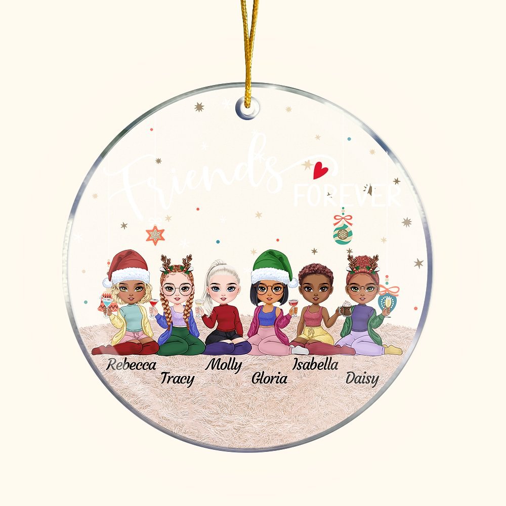 De conception unique, cet ornement suspendu en acrylique présente une charmante scène combinée à un élément de Noël qui montre une image réconfortante d'amis passants du temps ensemble. Avec l'ajout de la mention "Friends Forever" et d'un message personnalisé, il s'agit d'un souvenir spécial qui célèbre l'amour éternel entre les personnes.