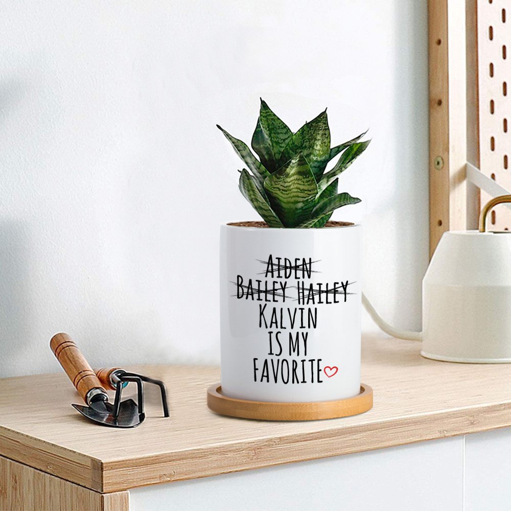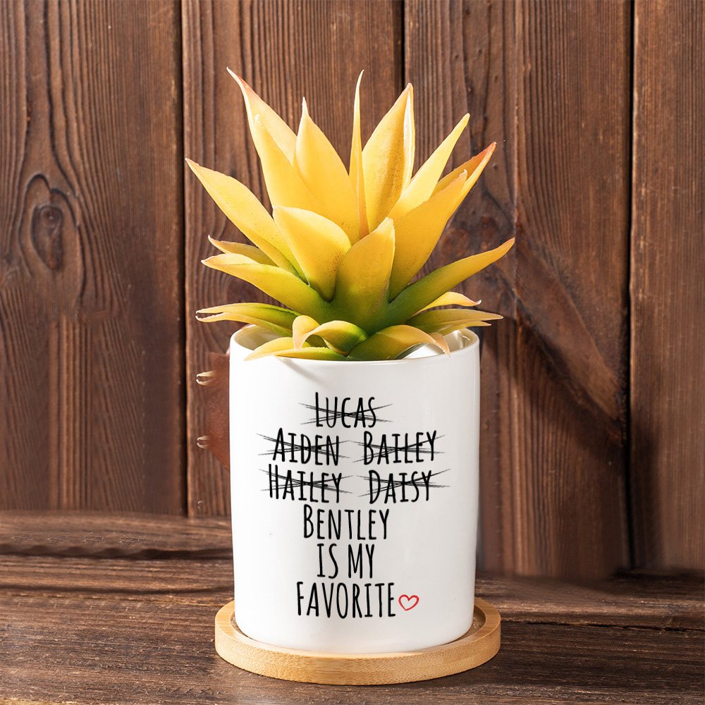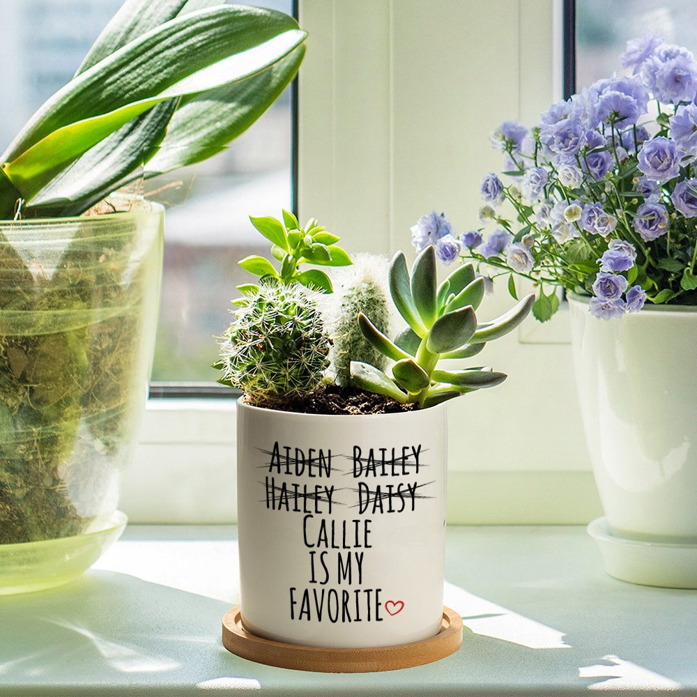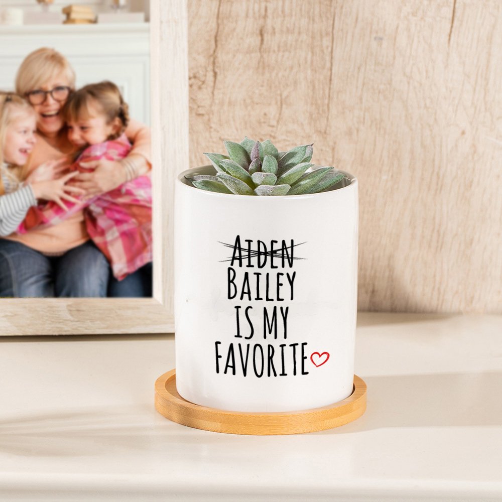 Chaque pot de fleurs peut être personnalisé avec 2 à 7 noms. Vous pouvez ainsi mettre en avant le nom de votre enfant préféré et laisser les autres noms en barré. C'est une merveilleuse façon d'exprimer votre amour et votre reconnaissance tout en vous moquant un peu de la dynamique de la fratrie que vous connaissez si bien.