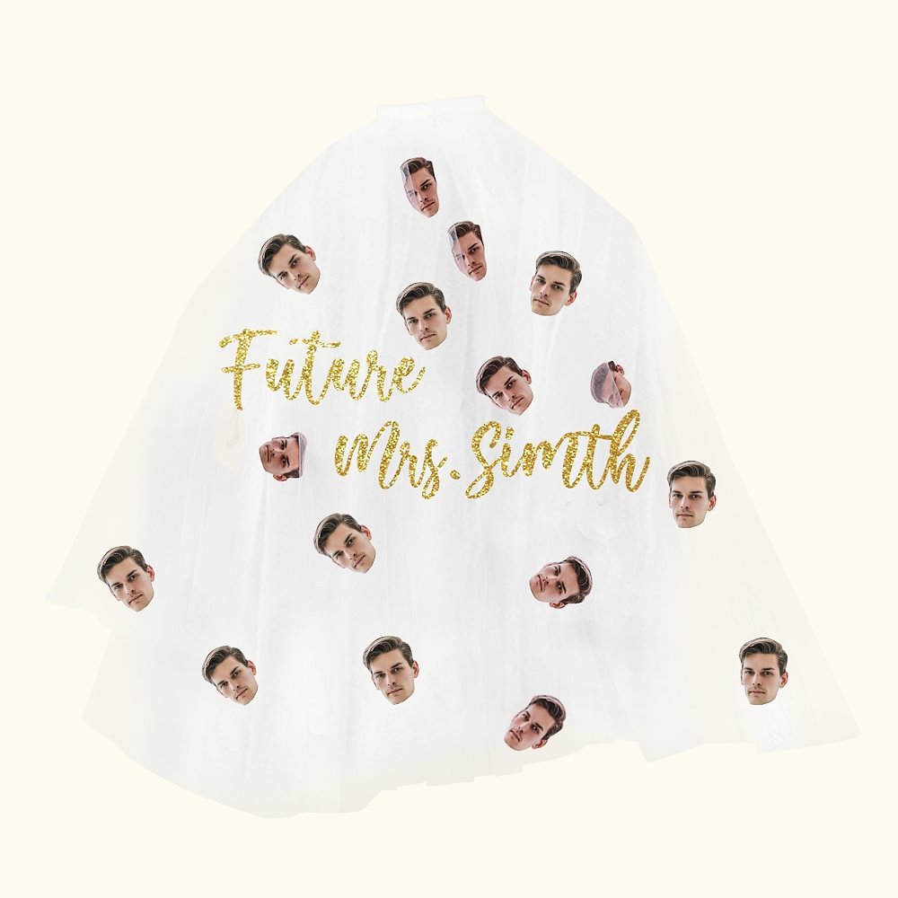Vous recherchez un voile super amusant et unique pour la bachelorette de votre vie ? Notre voile de tulle à deux couches comprend un texte personnalisé et plus de 40 photos de la tête du marié sur toute sa surface ! C'est génial ! Ce voile est un excellent moyen de faire démarrer la fête ! Idéal pour les enterrements de vie de jeune fille, les fêtes de mariage, les anniversaires, les fiançailles, ou même les idées de cosplay !