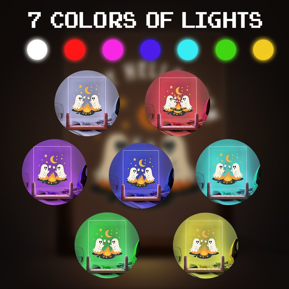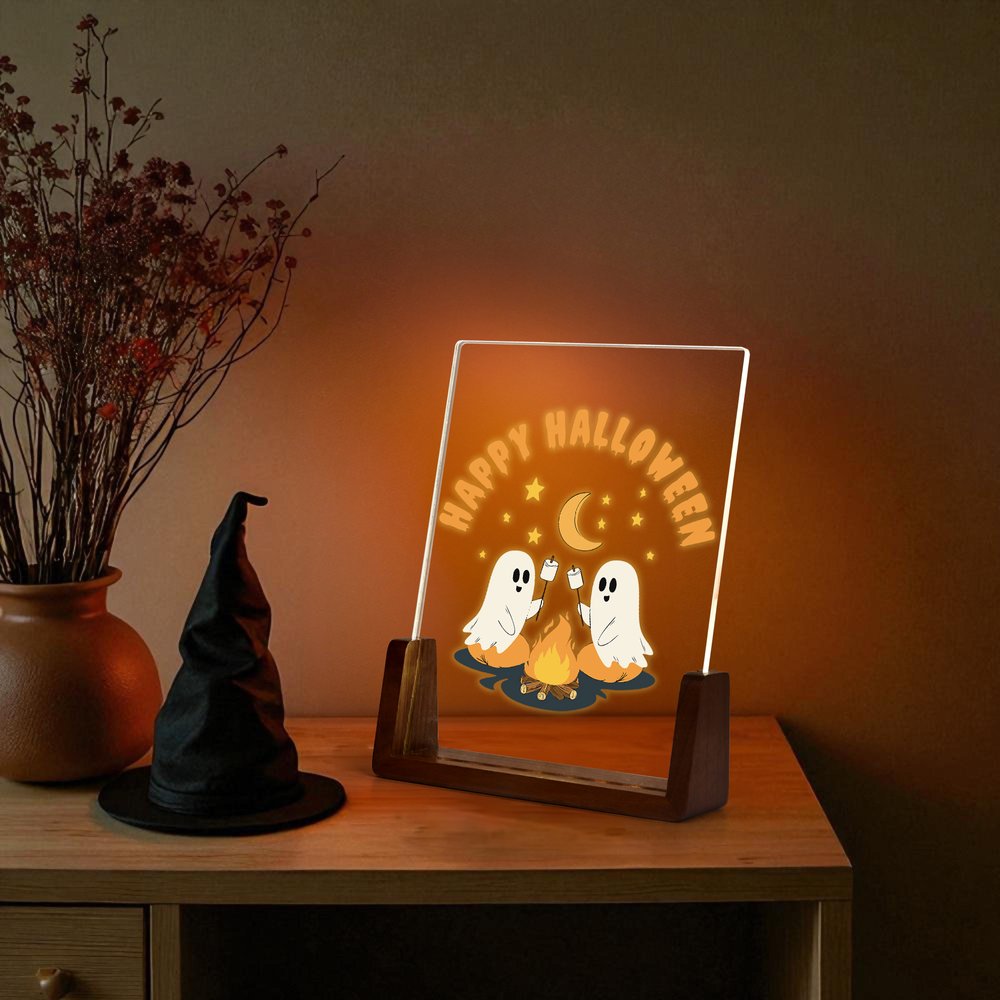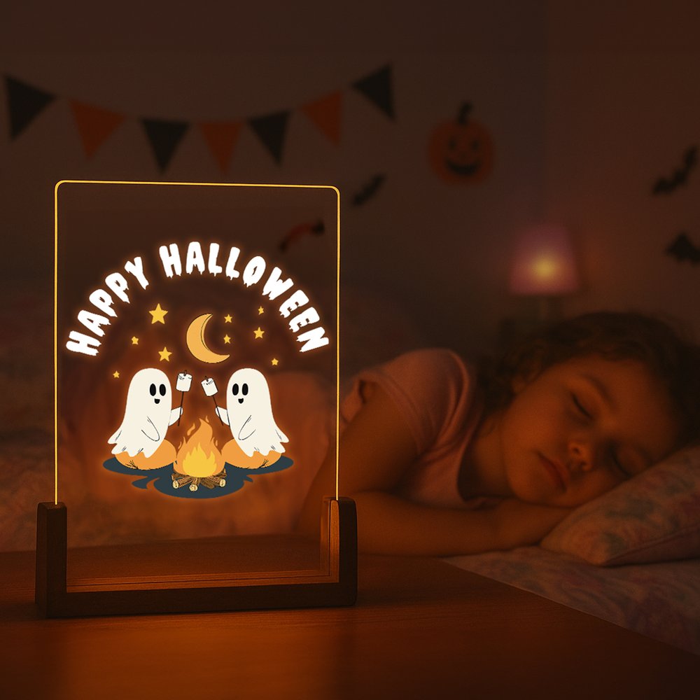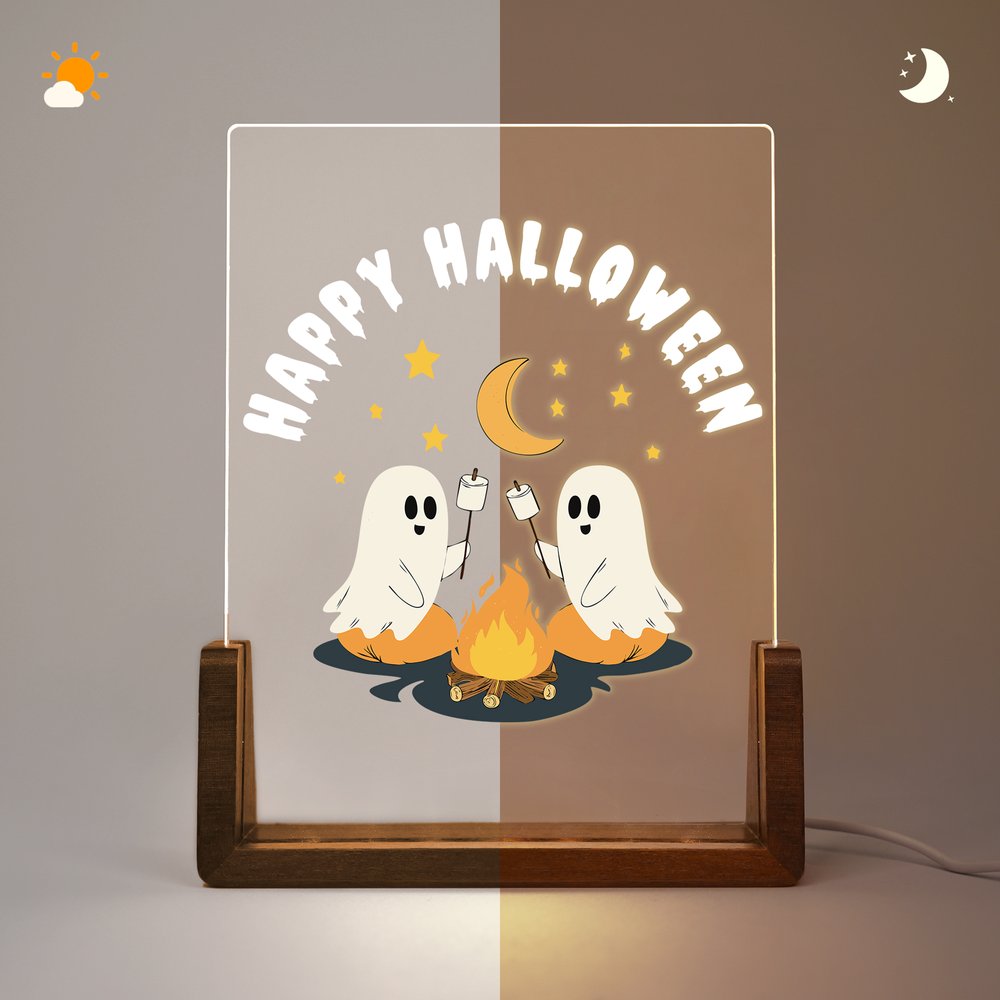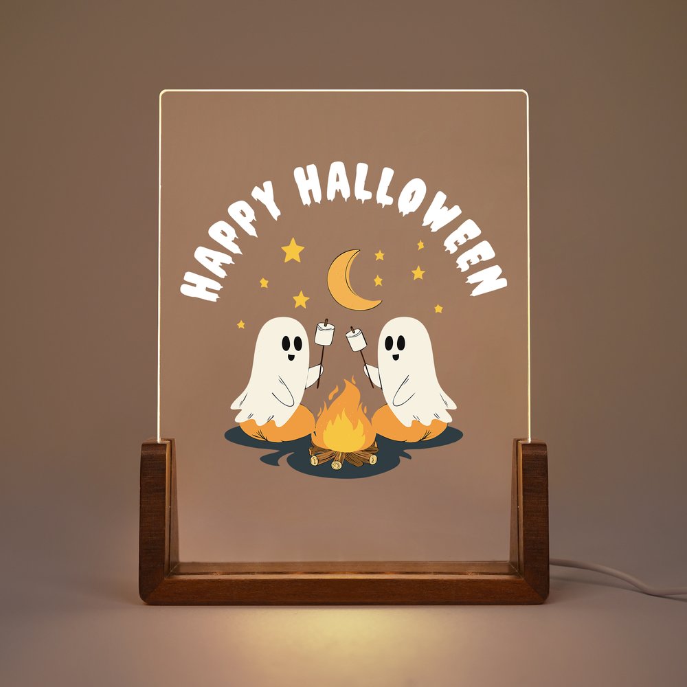 Le panneau acrylique est imprimé d'un fantôme enjoué assis autour d'un feu de camp en train de cuire des marshmallows, agrémenté d'étoiles et d'éléments lunaires, rompant avec l'horreur traditionnelle d'Halloween et mettant en valeur une atmosphère de guérison. Les couleurs des polices peuvent être choisies en fonction des préférences, associées à une base en bois naturel, et injectent dans l'espace un plaisir unique pour les fêtes de fin d'année.