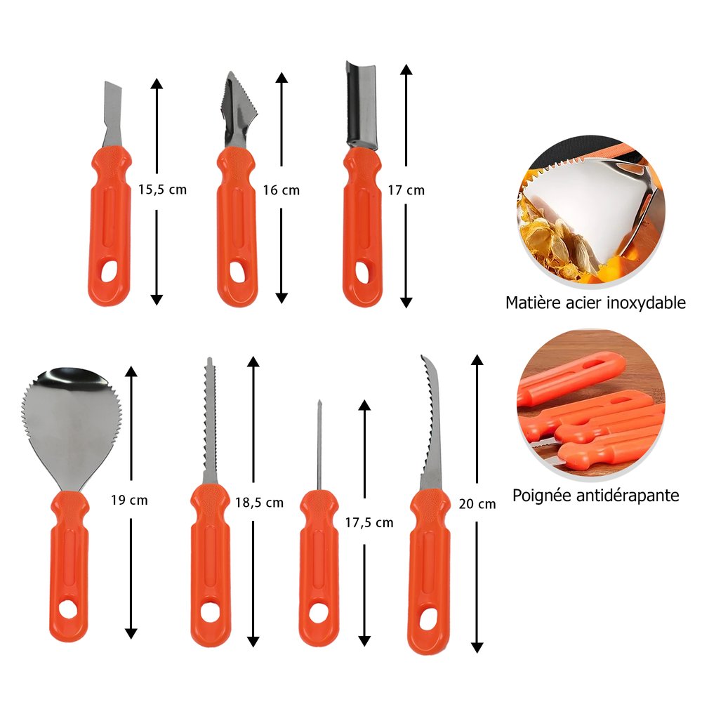 Spécialement conçus pour la préparation de la cuisine et la sculpture d'Halloween, ces outils permettent de façonner et d'évider les citrouilles, les légumes et les fruits. Ils sont également pratiques pour un usage quotidien. L'ensemble de 7 pièces comprend des outils tels qu'une pelle à citrouille et un couteau dentelé. Avec un seul ensemble, vous pouvez créer divers motifs de citrouilles, parfaits pour les séances de sculpture en famille ou les projets personnels, et rendre Halloween plus festive grâce à des activités pratiques.