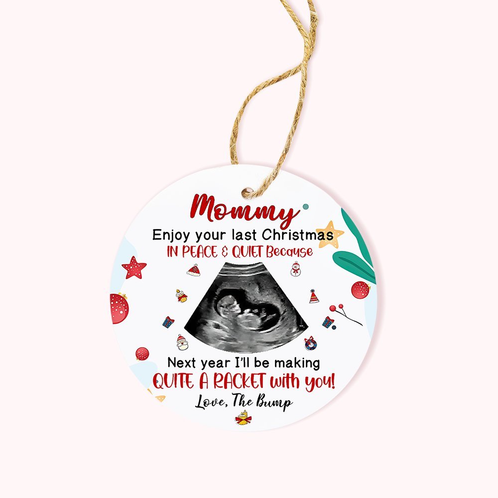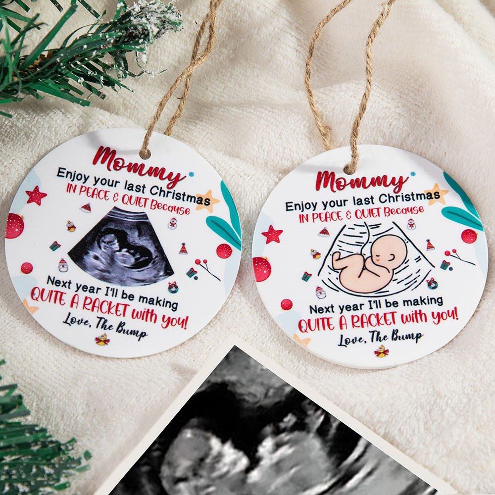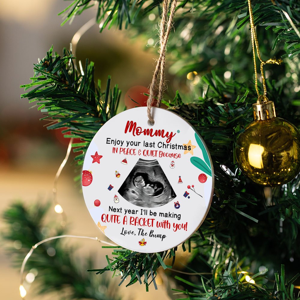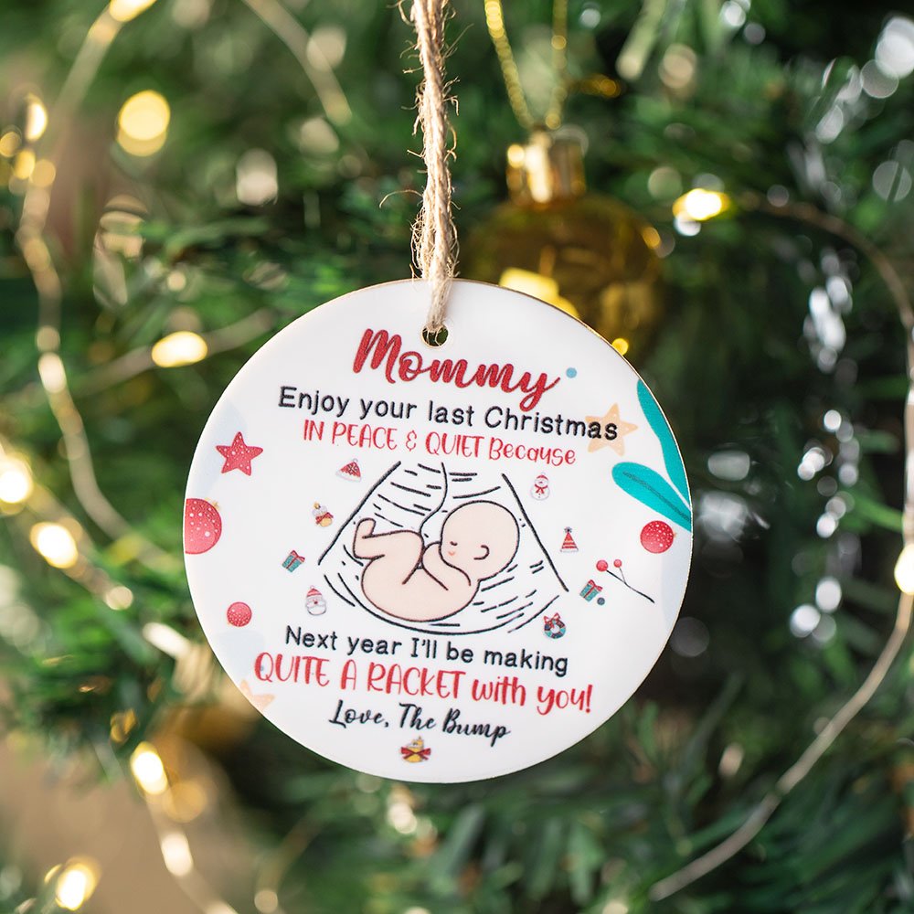 Les décorations de Noël adoptent le slogan "profitez de votre dernier Noël en paix et en silence car l'année prochaine, je ferai tout un raffut avec vous" avec la photo du bébé.