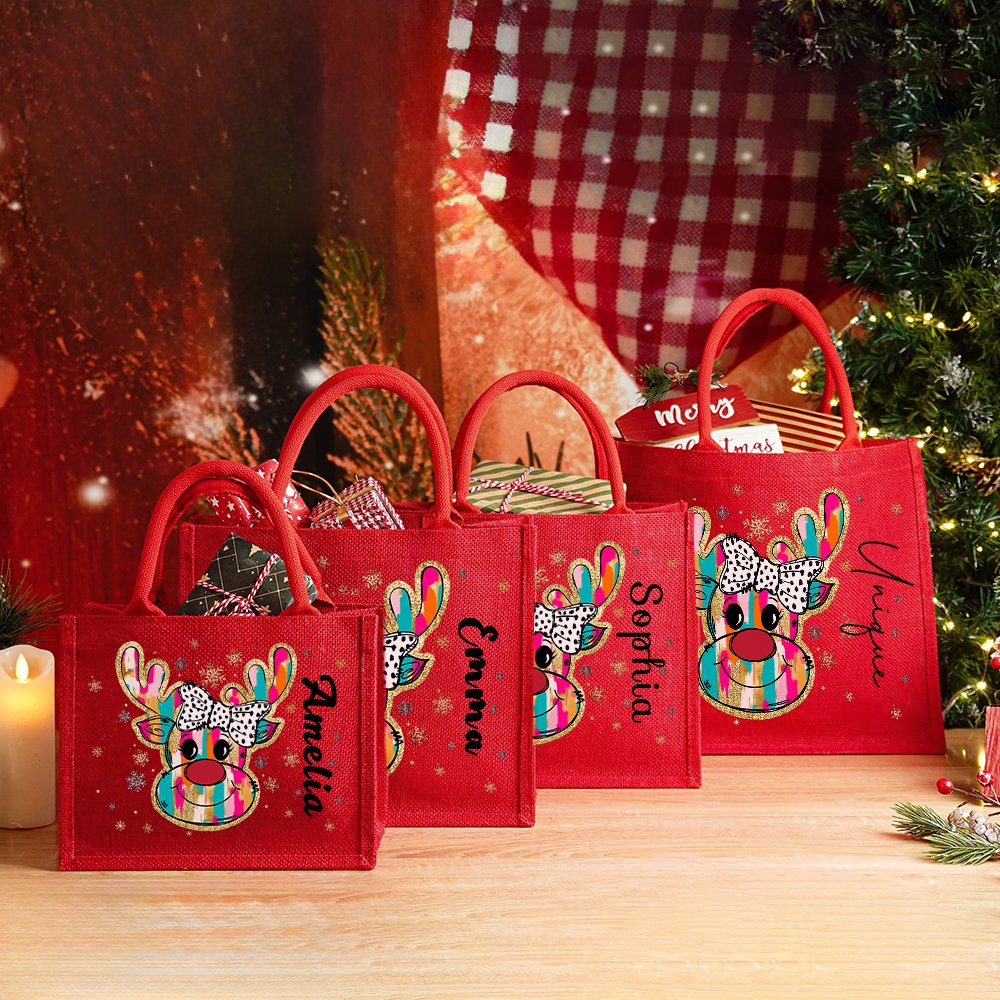 Ce sac fourre-tout en toile de jute a une forme unique, combinant des flocons de neige brillants, des nœuds tachetés et des motifs festifs de tête de renne. Le style général est dynamique et met en valeur l'atmosphère festive de l'hiver. Vous pouvez inscrire votre nom sur le sac pour en faire un article unique et personnalisé.