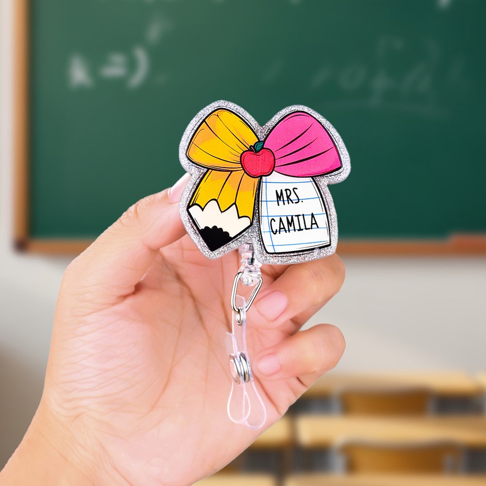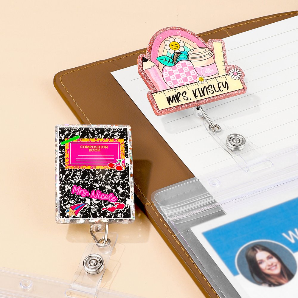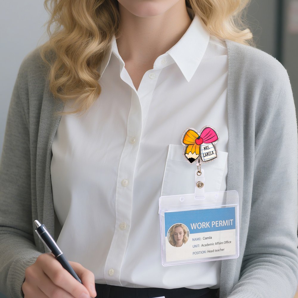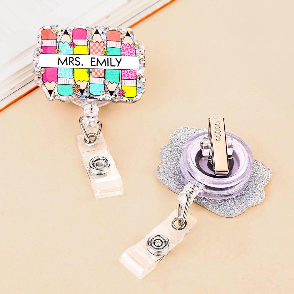 Cette bobine de badge est dotée d'un film scintillant qui attire l'attention et brille de mille feux ! Avec 6 motifs uniques ornés d'éléments sur le thème de l'enseignement tels que des crayons, des cahiers, des fleurs et des nœuds, il incarne parfaitement l'essence de la profession d'enseignant. Ces détails charmants ajoutent de l'amusement et de l'éclat à la routine quotidienne d'un enseignant. Chaque bobine de badge peut être personnalisée avec un titre et un nom de famille, reflétant ainsi votre personnalité et votre style uniques.