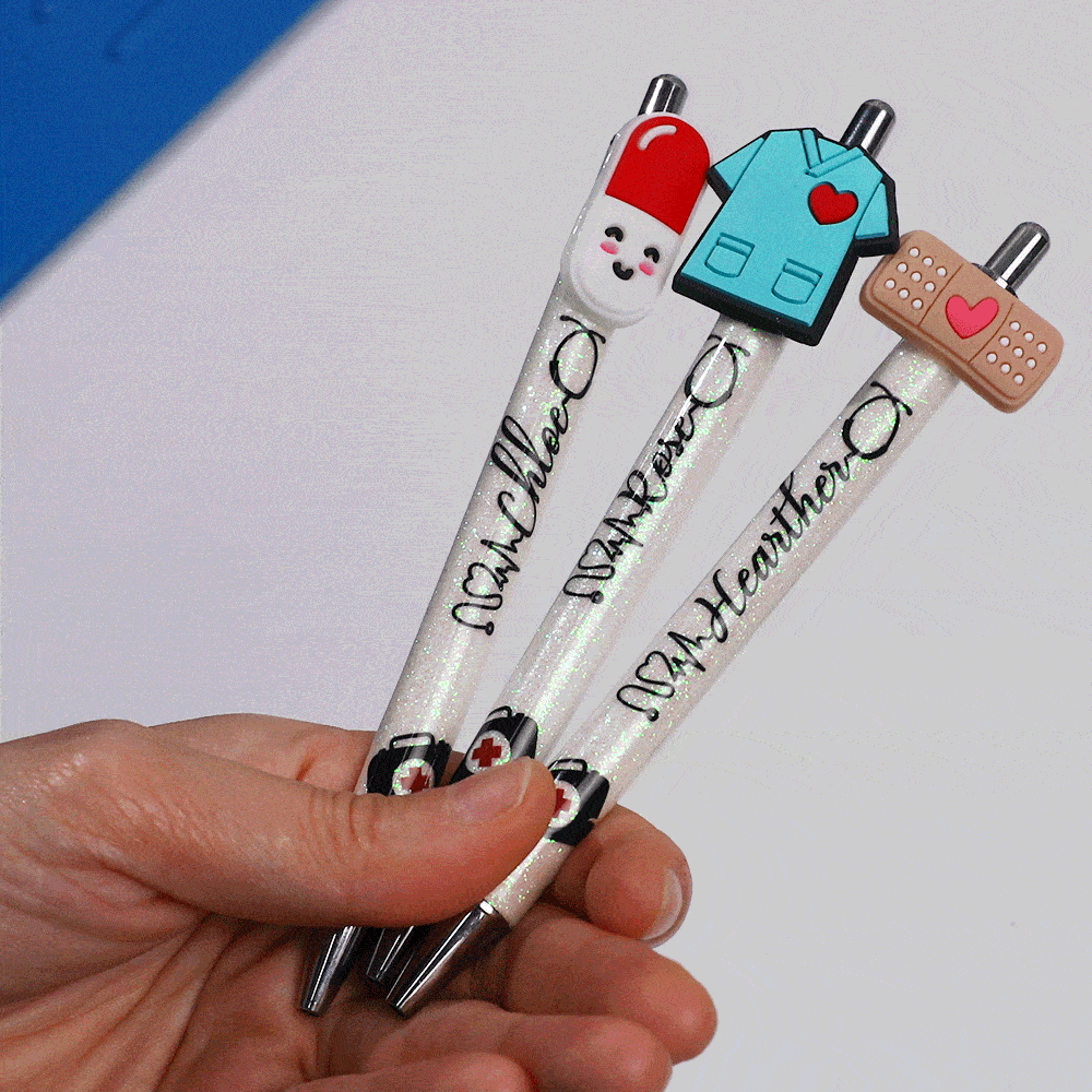 Notre stylo pailleté pour infirmière, fabriqué à la main, présente un adorable motif sur le dessus. Chaque stylo est fabriqué avec soin et attention aux détails, ce qui vous garantit un produit de haute qualité. Vous pouvez personnaliser le stylo avec un nom pour en faire un cadeau unique et attentionné.