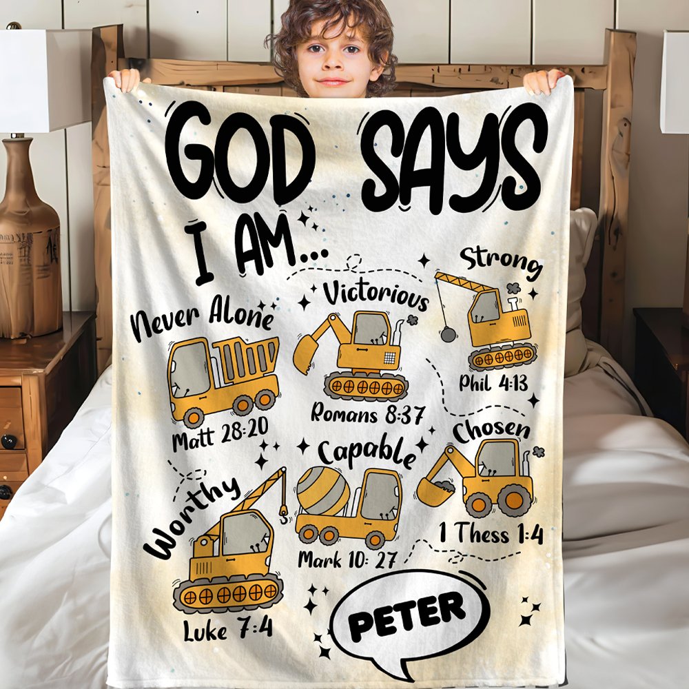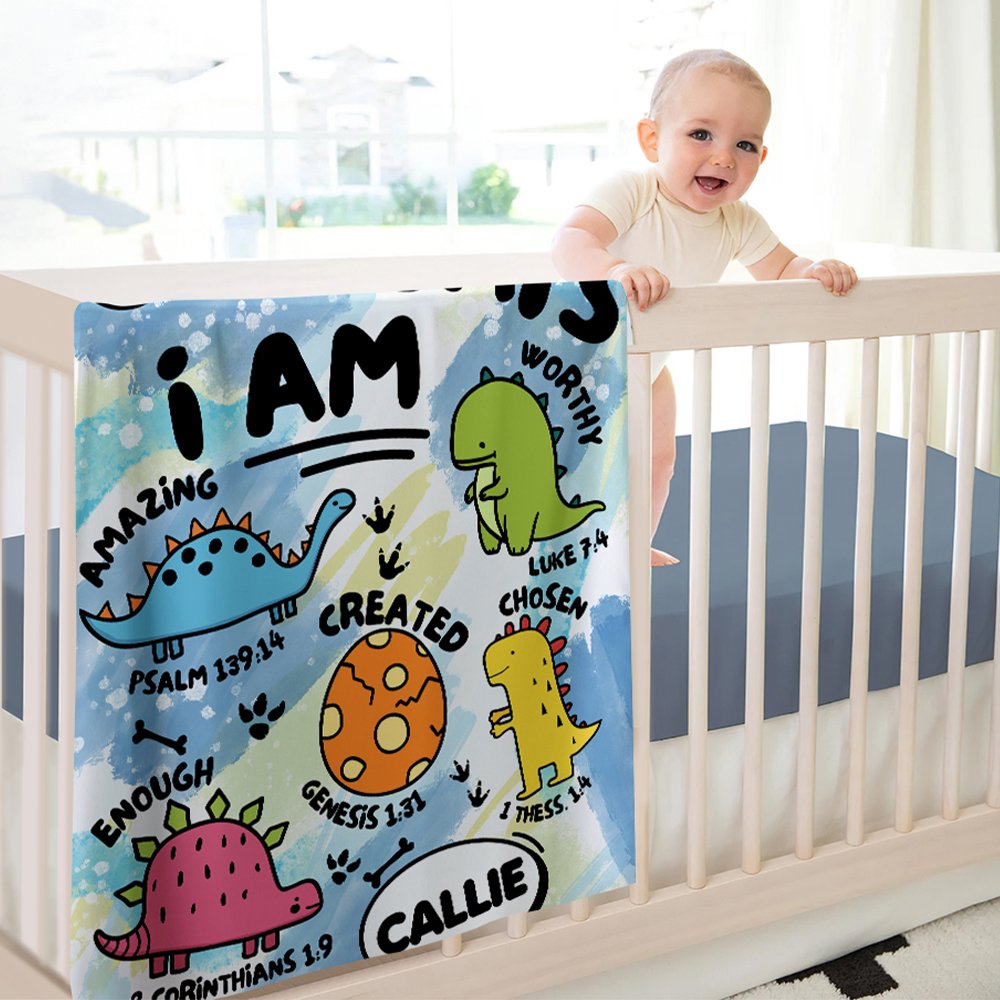 Cette couverture douce est imprimée sur trois thèmes, dont les véhicules techniques, les dinosaures et les animaux, avec des couleurs vives et une grande variété. Elle est associée à "Dieu dit que je suis" et à des citations bibliques motivantes pour inspirer la foi des enfants. Vous pouvez ajouter le nom de votre enfant pour créer une décoration unique.