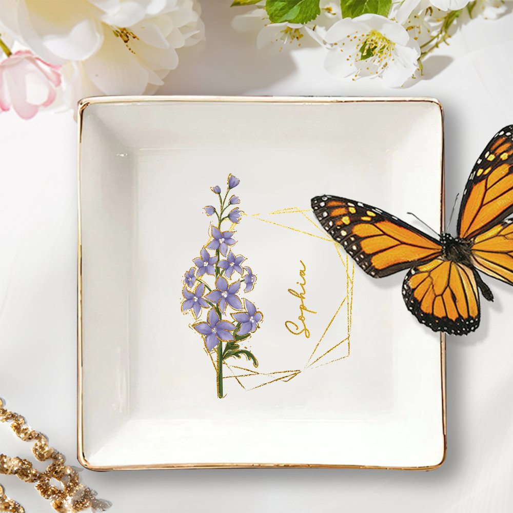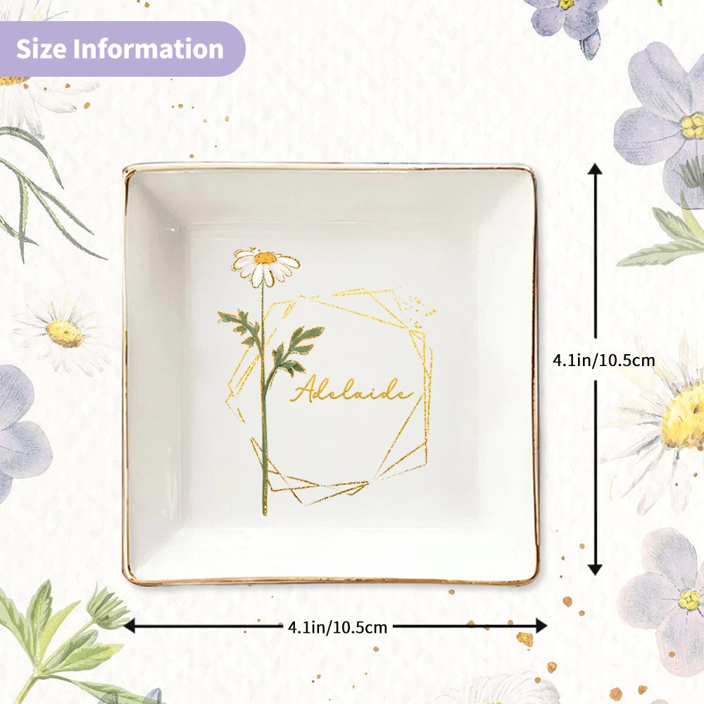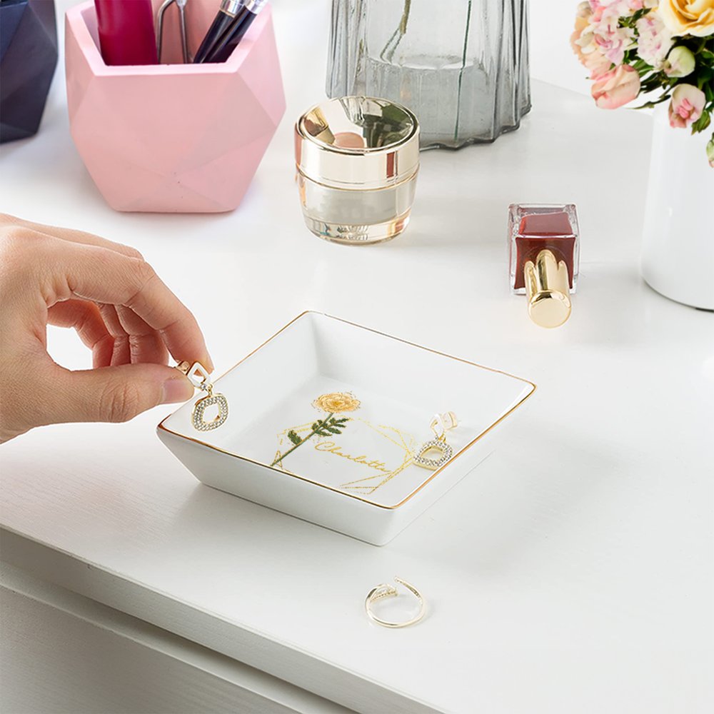 Ce bibelot est orné d'une magnifique fleur de naissance aux bords dorés et peut être personnalisé avec votre nom. Exquis et élégant, il constitue un cadeau vraiment significatif pour n'importe quelle femme.