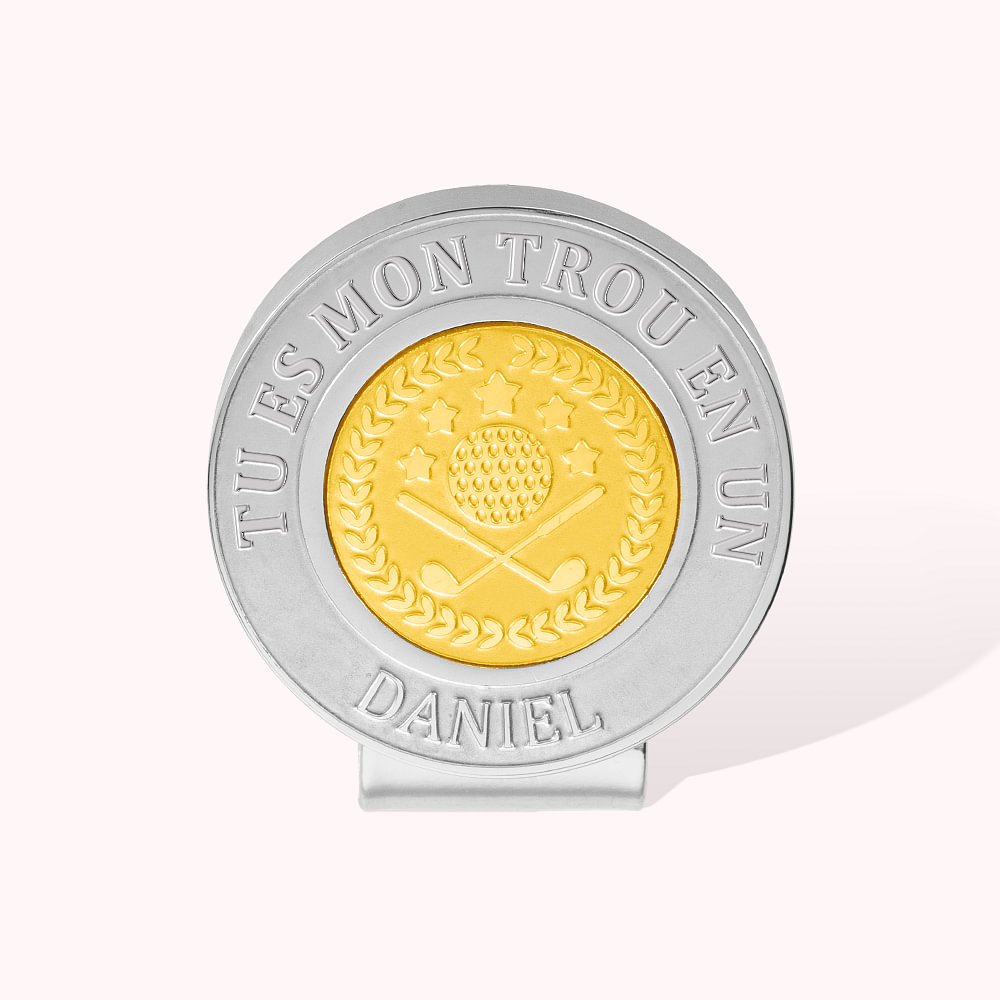 Un marqueur de golf sert à marquer l'endroit d'un putting green d'où est soulevée une balle de golf. Ce produit s'inspire des pièces de monnaie et des médailles, afin d'offrir à votre amateur de golf préféré un cadeau inoubliable. Les textes en relief ajoutent non seulement de la personnalité mais aussi une touche de délicatesse. Le marqueur de balle de golf personnalisé est doté d'un clip magnétique en acier inoxydable qui s'adapte au bord du chapeau.