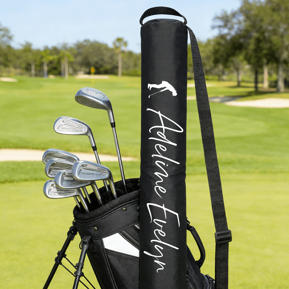 Ce sac à bière personnalisé présente un extérieur noir élégant associé à un lettrage blanc personnalisé et à une silhouette classique de golfeur. Son design épuré et sportif lui confère un aspect moderne et haut de gamme, tandis que les détails personnalisés en font un objet unique, parfait pour afficher votre style sur le parcours et au-delà.