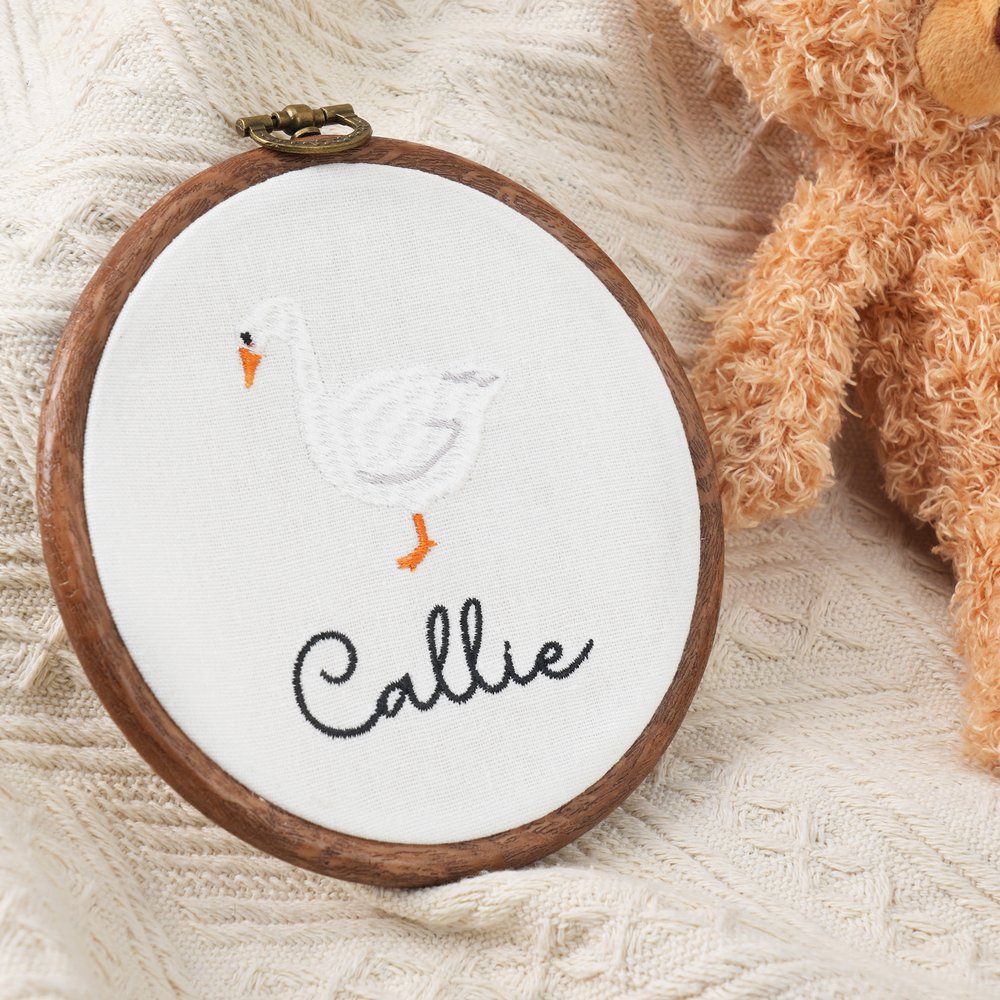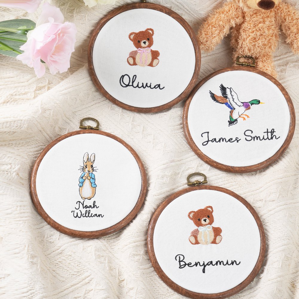 Cet ornement présente une série d'adorables motifs de broderie sur le thème des animaux, notamment des oies, des colverts, des ours, des lapins Peter et des vaches Highland. Le design général est plein de chaleur et de charme enfantins. Il est également possible de le personnaliser avec le nom de votre enfant, ce qui ajoute une touche très personnelle et mémorable à l'objet.