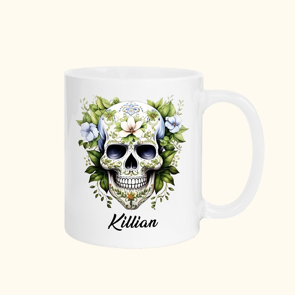 Ce mug présente un motif de crâne de sucre accrocheur, magnifiquement orné de détails complexes et de couleurs vibrantes. L'ajout d'éléments personnalisés, tels que le nom de l'être cher et sa fleur de naissance, transforme cette tasse en un trésor unique, avec un design unique qui combine des éléments gothiques avec des motifs traditionnels de crâne en sucre, parfait pour ceux qui apprécient la beauté du crâne et l'esprit de la fête.
