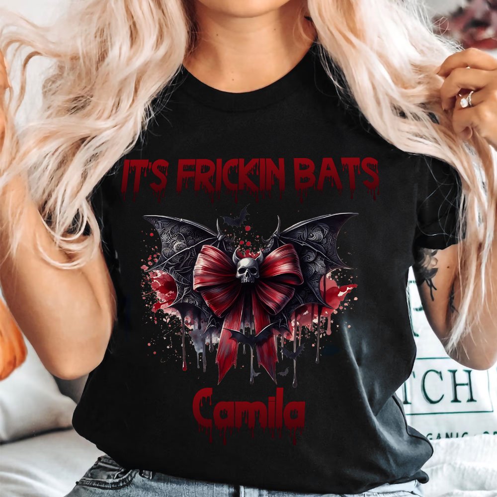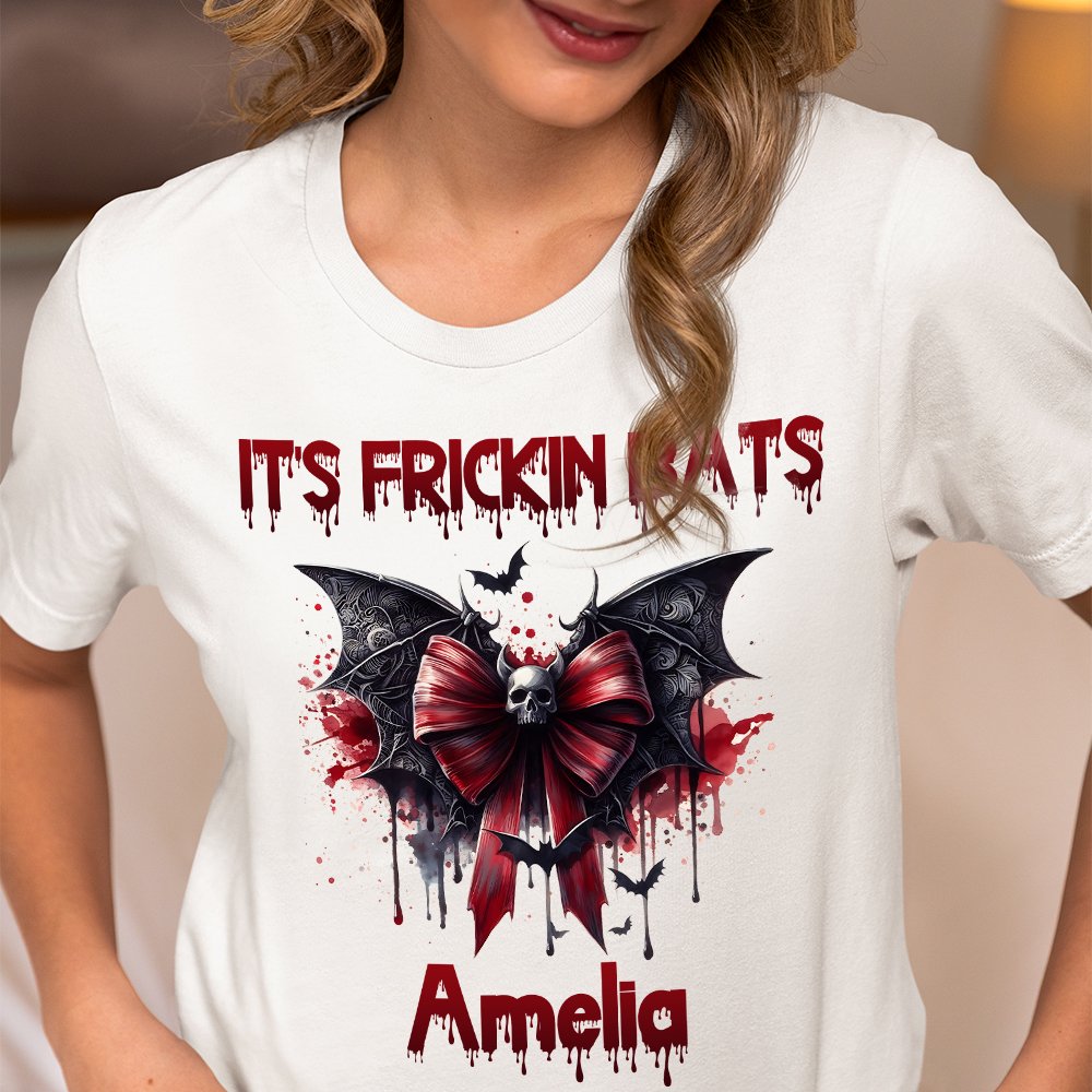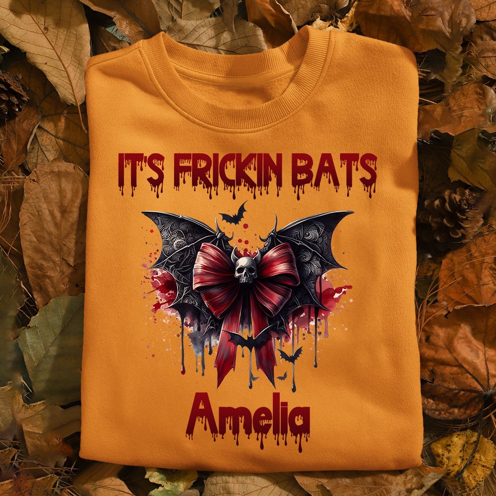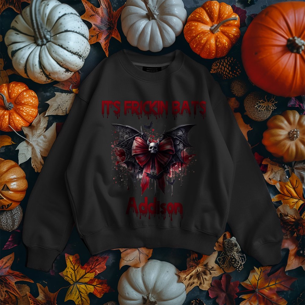 Ce vêtement est orné d'un motif gothique de tête de mort et de chauve-souris, qui évoque l'esprit d'Halloween. Il peut être personnalisé avec un nom personnel pour en faire un accessoire unique en son genre.
