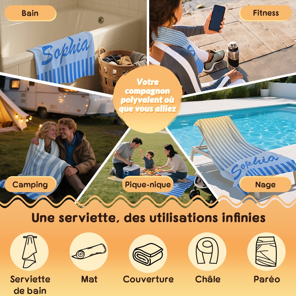 Serviette de plage en microfibre personnalisée avec nom - Accessoire pour les vacances et voyages - Cadeau d'anniversaire pour la famille et les amis