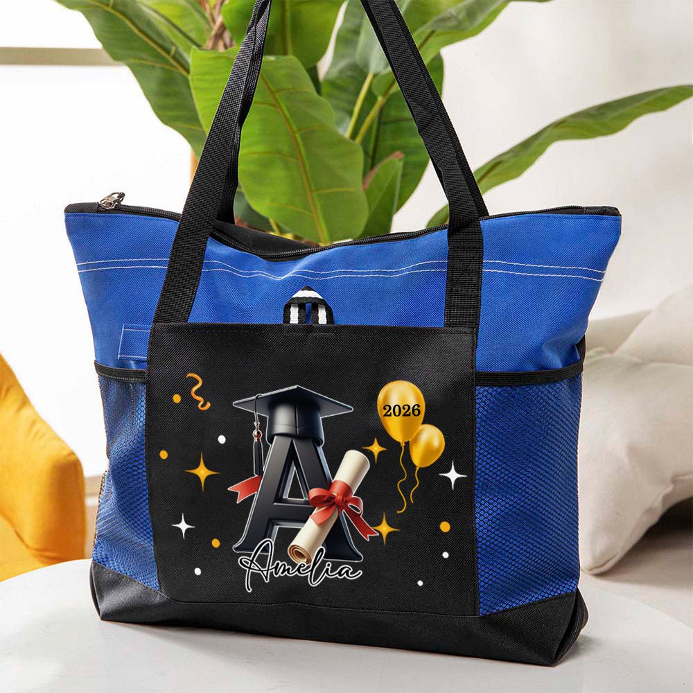 Personnalisez ce fourre-tout avec le nom, les initiales et l'année d'obtention du diplôme du diplômé pour le rendre unique. Les initiales du diplômé sont artistiquement ornées d'un bonnet de fin d'études, symbolisant la réussite scolaire et le nouveau chapitre de la vie qui s'ouvre devant lui. L'arrière-plan du motif est orné de ballons et de serpentins vibrants, qui évoquent une ambiance joyeuse et festive.