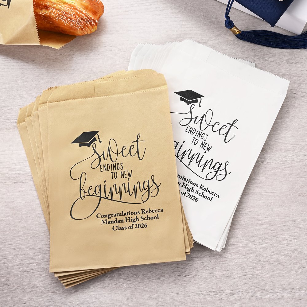 Ce sac à friandises est proposé dans un format adapté, avec l'option du papier blanc ou kraft. Nous proposons 5 modèles avec des phrases différentes qui peuvent être personnalisées avec le nom du diplômé, l'école et l'année. Ces sacs vous permettront de vous démarquer lors de votre fête et de montrer votre reconnaissance à tous ceux qui célèbrent ce jour spécial avec vous.