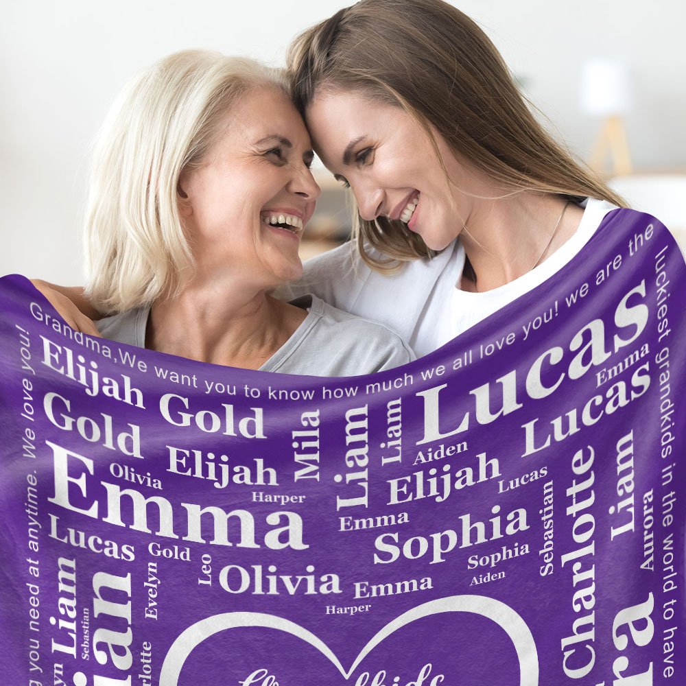 Les couvertures "Grandkids Make Life Grand" sont d'excellents cadeaux pour les grands-parents ou les arrière-grands-parents ! Les grands-parents ressentiront la chaleur de vos mots d'amour lorsqu'ils seront enveloppés dans la chaleur de leur couverture douillette avec les noms de tous les petits-enfants, que les grands-parents seront ravis de recevoir ! Pour Noël, Thanksgiving, les anniversaires, l'anniversaire de la grand-mère ou d'autres occasions spéciales, la couverture spéciale de la grand-mère ou du grand-père avec les noms de ses petits-enfants sera leur cadeau le plus précieux.