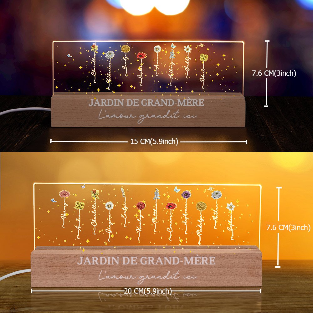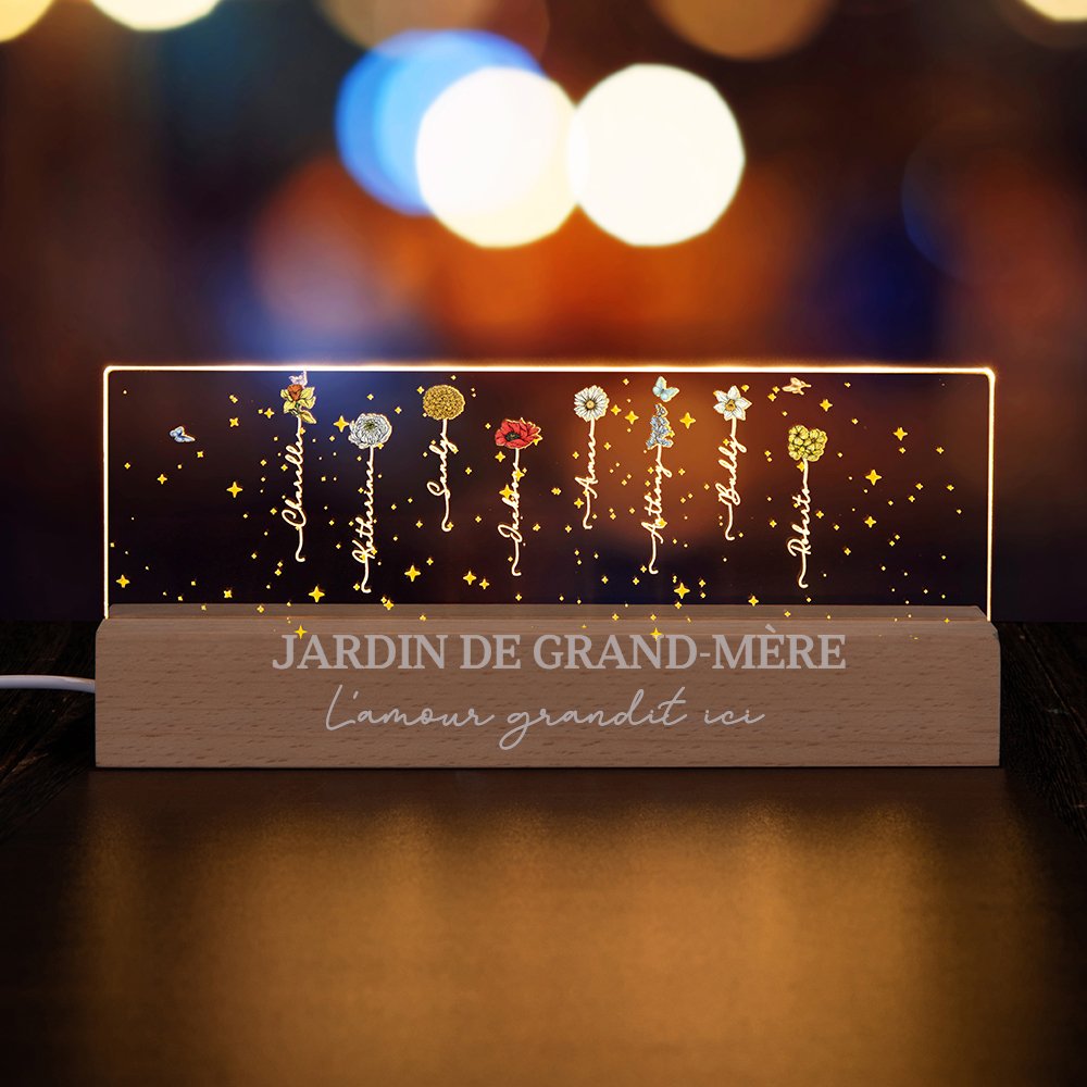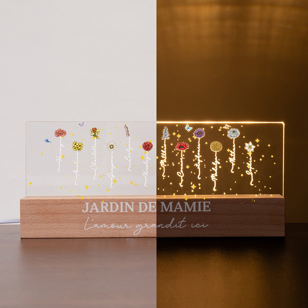 Chaque fleur de naissance représente un membre de la famille, créant ainsi un arbre généalogique lumineux qui rayonne de chaleur et d'amour. Vous avez le choix entre 12 sortes de fleurs d'anniversaire. Des lumières LED éclairent doucement les motifs floraux complexes, créant une ambiance douce et apaisante dans n'importe quelle pièce. Il ne s'agit pas seulement d'une lumière, mais d'un hommage chaleureux aux liens familiaux et aux souvenirs précieux.