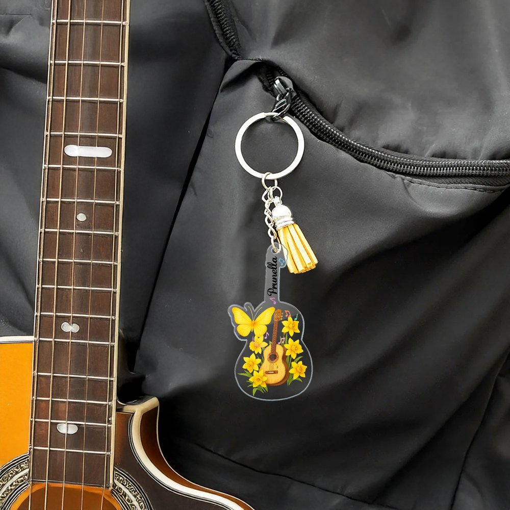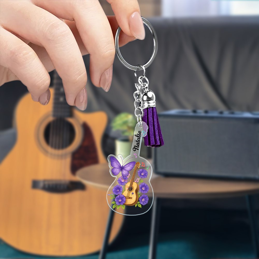 Ce porte-clés est composé d'une guitare et de fleurs de naissance. Il allie l'énergie de la musique à la beauté de la nature. Les notes de musique qui tombent et les papillons qui voltigent incarnent l'énergie de la musique, tandis que les fleurs de naissance, personnalisées en fonction de votre mois de naissance, transmettent un message personnalisé. Le pompon assorti complète le motif et ajoute une touche ludique. Votre nom est personnalisé dans une police artistique, créant ainsi un accessoire vraiment unique.