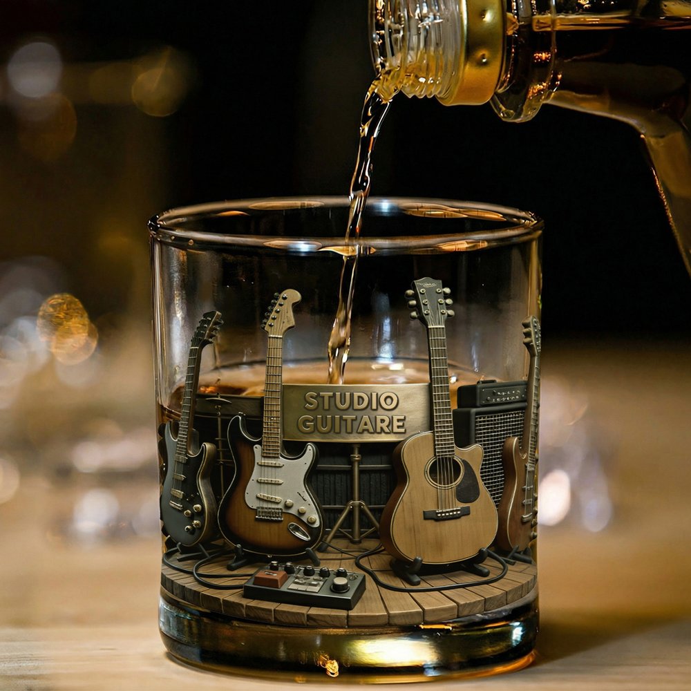Avec ses motifs inspirés de guitares, d'amplificateurs, de pédales d'effets et de matière d'enregistrement, ce verre évoque l'atmosphère d'un studio de musique professionnel. Le texte personnalisable vous permet d'exprimer votre passion pour la musique à travers le design, ce qui donne une pièce distinctive et artistique.