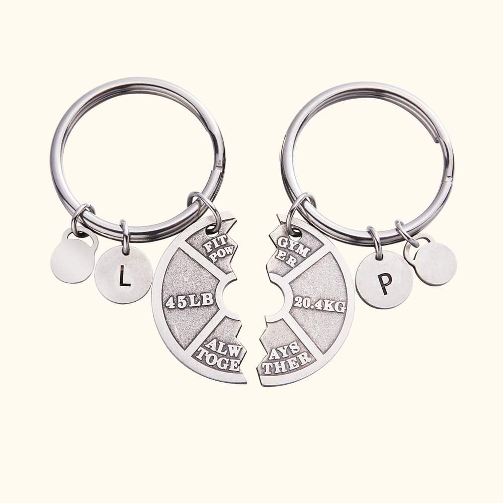 Ce porte-clés est une pièce de style haltère pour les couples qui fréquentent la salle de sport, avec un seul porte-clés avec une plaque de poids cassée, deux porte-clés assortis viennent juste de se réunir pour former un look complet et restaurer les mots "ALWAYS TOGETHER". La surface du porte-clés a une finition vieillie pour recréer de manière plus réaliste le fait d'être dans une salle de sport.