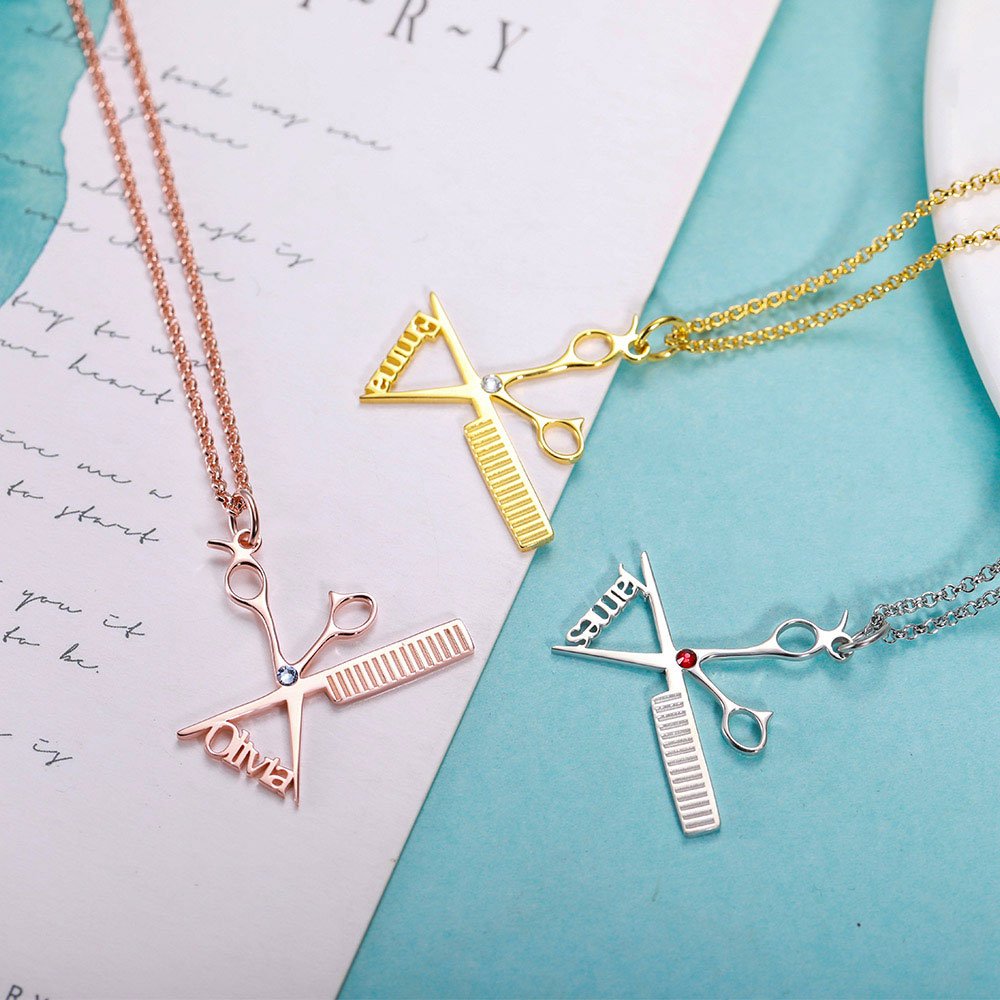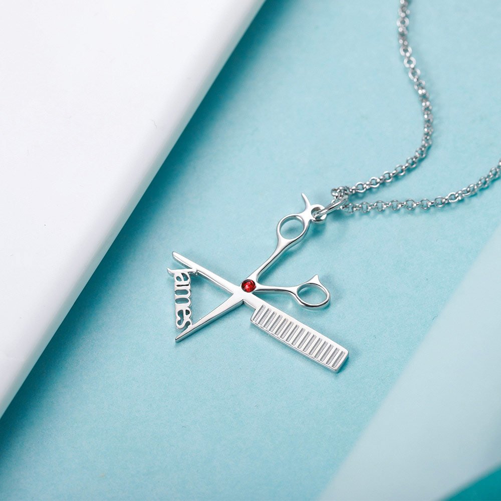 • Collier distinctif conçu pour tous ceux qui aiment la coiffure. Avec une combinaison d'un ciseau et d'un peigne, magnifiquement orné d'une pierre de naissance cristallisée. Prénom personnalisé orné sur la pointe des ciseaux.