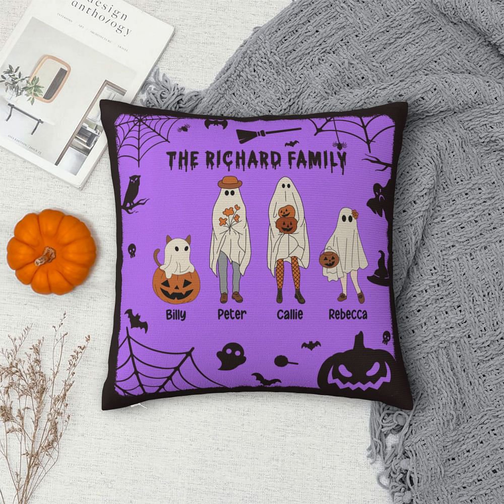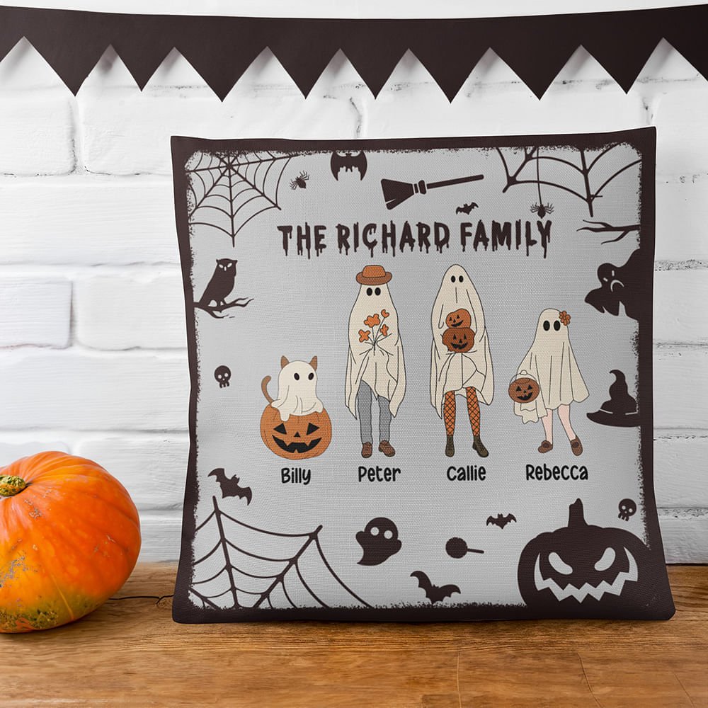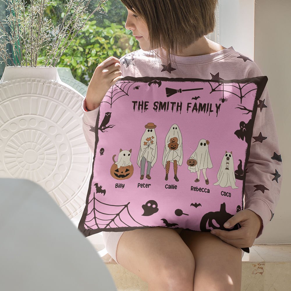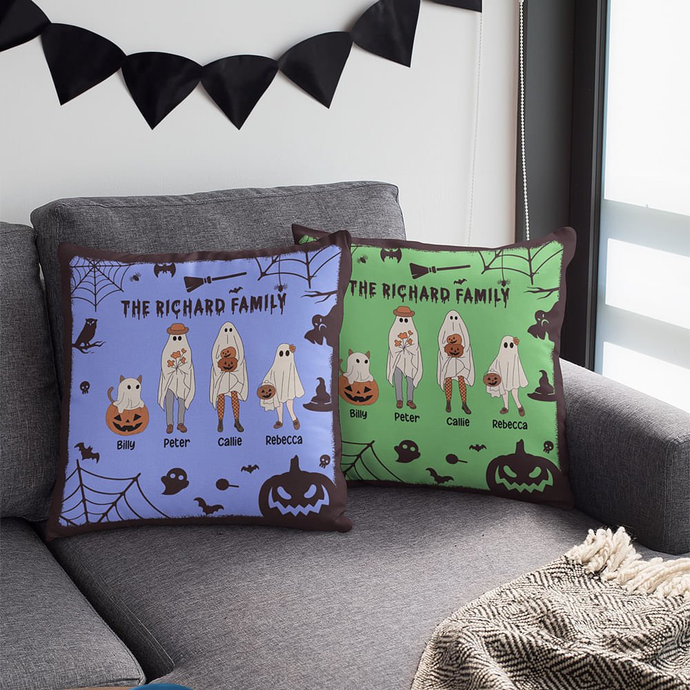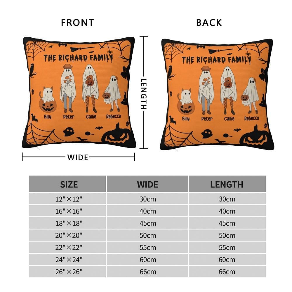 Cette taie d'oreiller est conçue sur le thème d'Halloween. Les couleurs classiques sont assorties à la famille de fantômes au centre, ainsi qu'aux éléments représentatifs de la fête tels que les citrouilles, les toiles d'araignée, les chauves-souris, les hiboux, etc., créant ainsi une atmosphère sinistre et effrayante.