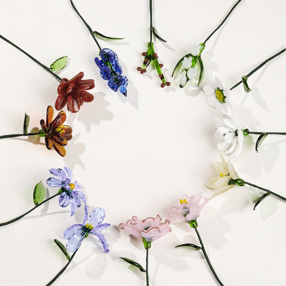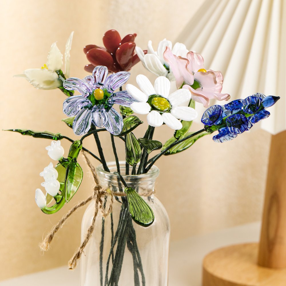 Fabriqué à partir d'un verre de haute qualité et d'un fil de fer flexible, ce bouquet allie beauté délicate et durabilité. Le verre confère à chaque pétale/feuille un éclat cristallin et lumineux (comme des fleurs figées dans une pierre précieuse), tandis que les tiges en fil de fer vous permettent de disposer le bouquet librement.