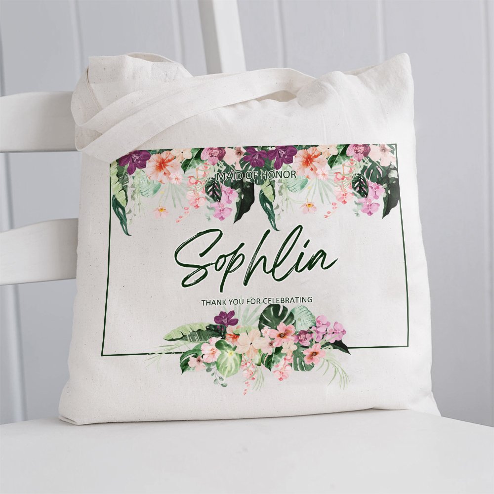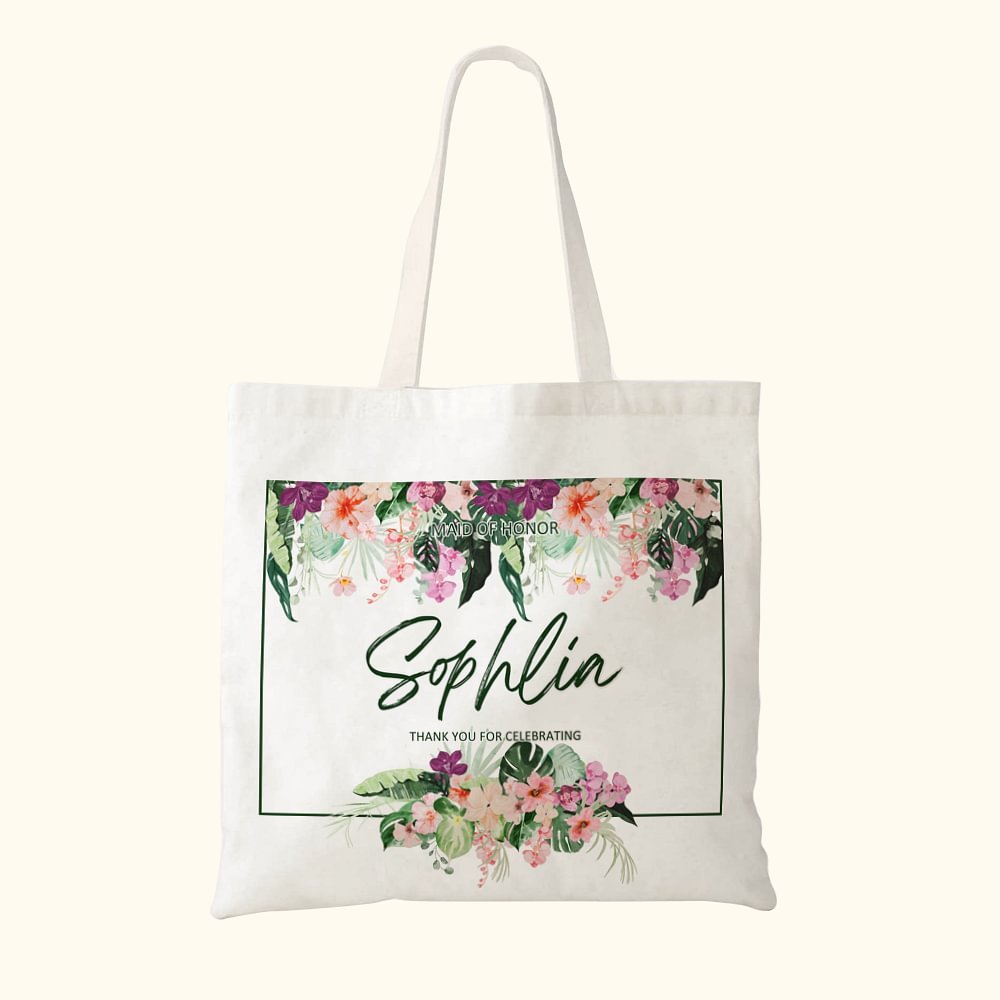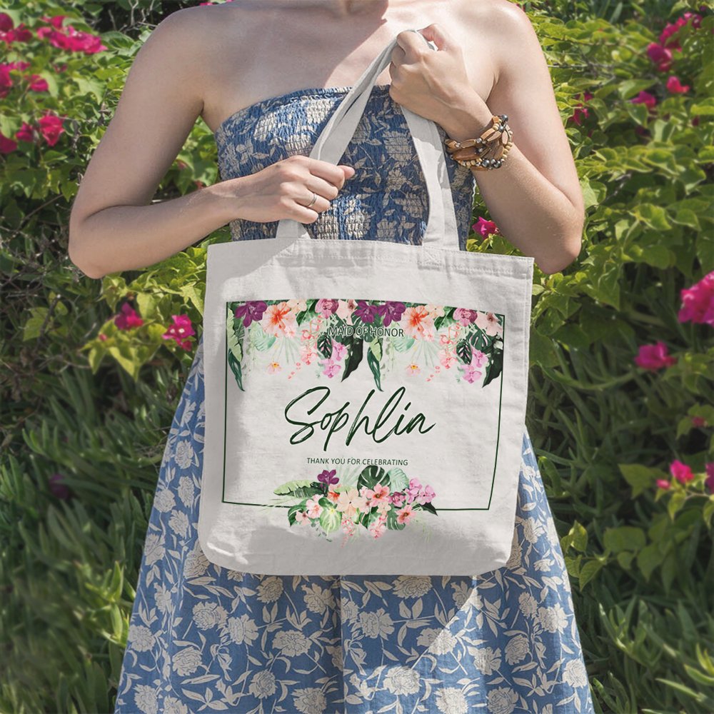 Inspiré par la beauté et l'essence d'Hawaï, ce sac fourre-tout présente un design vibrant et accrocheur qui capture l'essence du paradis tropical. Les motifs floraux colorés en font un accessoire élégant qui s'accorde avec n'importe quelle tenue et fait ressortir l'atmosphère chaleureuse de la fête de mariage.
