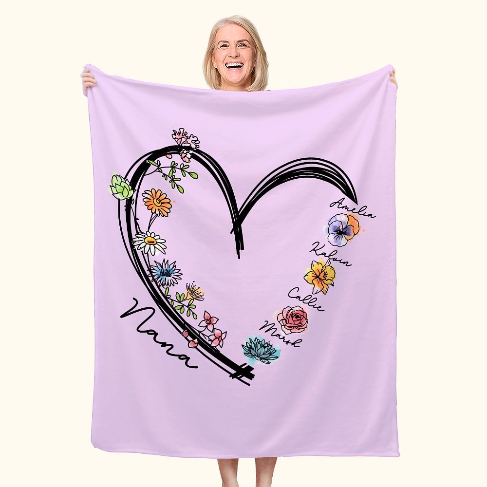 Ce plaid douillet en forme de cœur peut être personnalisé avec 1 à 6 noms et les fleurs de naissance correspondantes. Chaque fleur symbolise l'amour et le lien entre les membres de la famille, créant ainsi une pièce sentimentale qui représente bien plus qu'une simple couverture.
