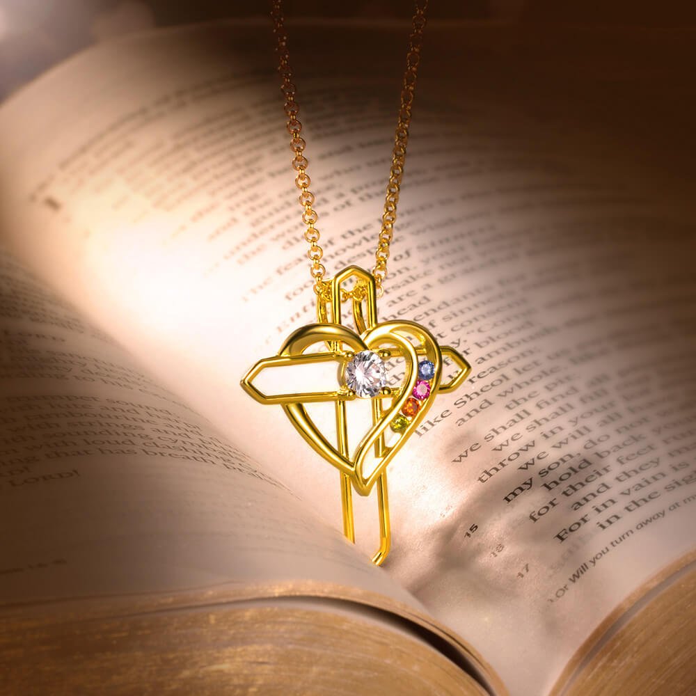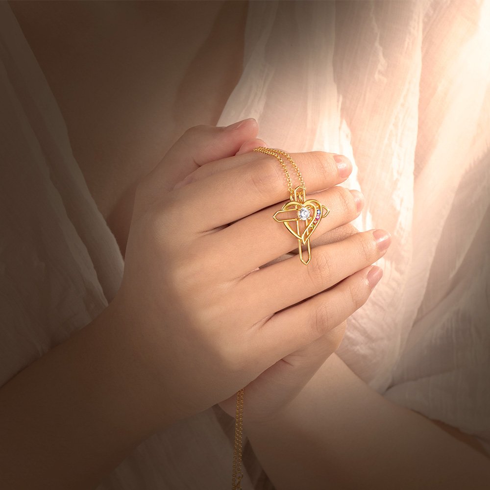 • Collier d'amour croix exprimant parfaitement la foi et l'amour. La croix est un symbole de foi et le cœur représente l'amour. Collier approprié à celui qui a la foi religieuse et l'amour dans le cœur. Chaque pierre de naissance scintillante dans le collier représentant un enfant. Conseil: Couleur de la gemme principale au milieu fixe et la couleur de la petite pierre de naissance au cœur sélectionnée.