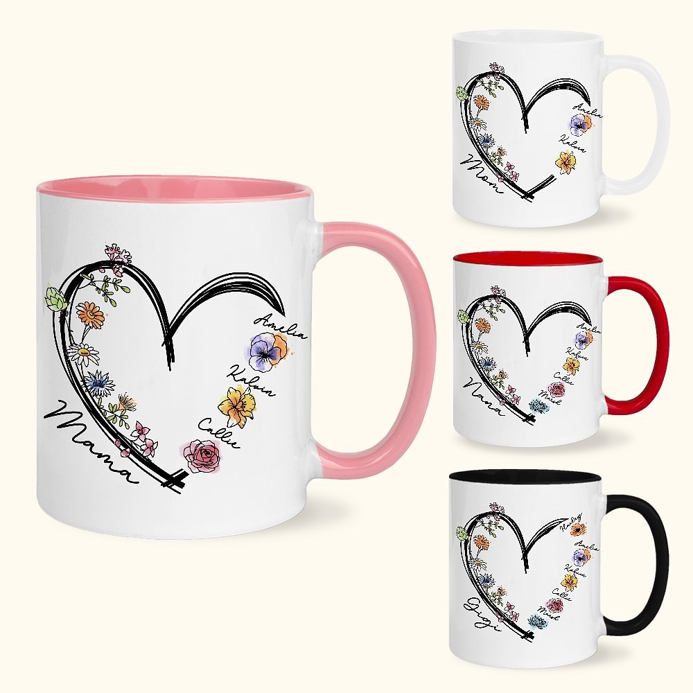 Ce mug se distingue par son design unique et son aspect élégant. Le motif en forme de cœur est astucieusement placé au centre du mug, délimité par un cœur aimant, avec un bouquet fixe à gauche et une fleur de naissance correspondant à chaque personne à droite, chaque fleur symbolisant l'amour et la gratitude. Vous pouvez également ajouter un nom ou un surnom pour ajouter une touche personnelle et créer une pièce unique.