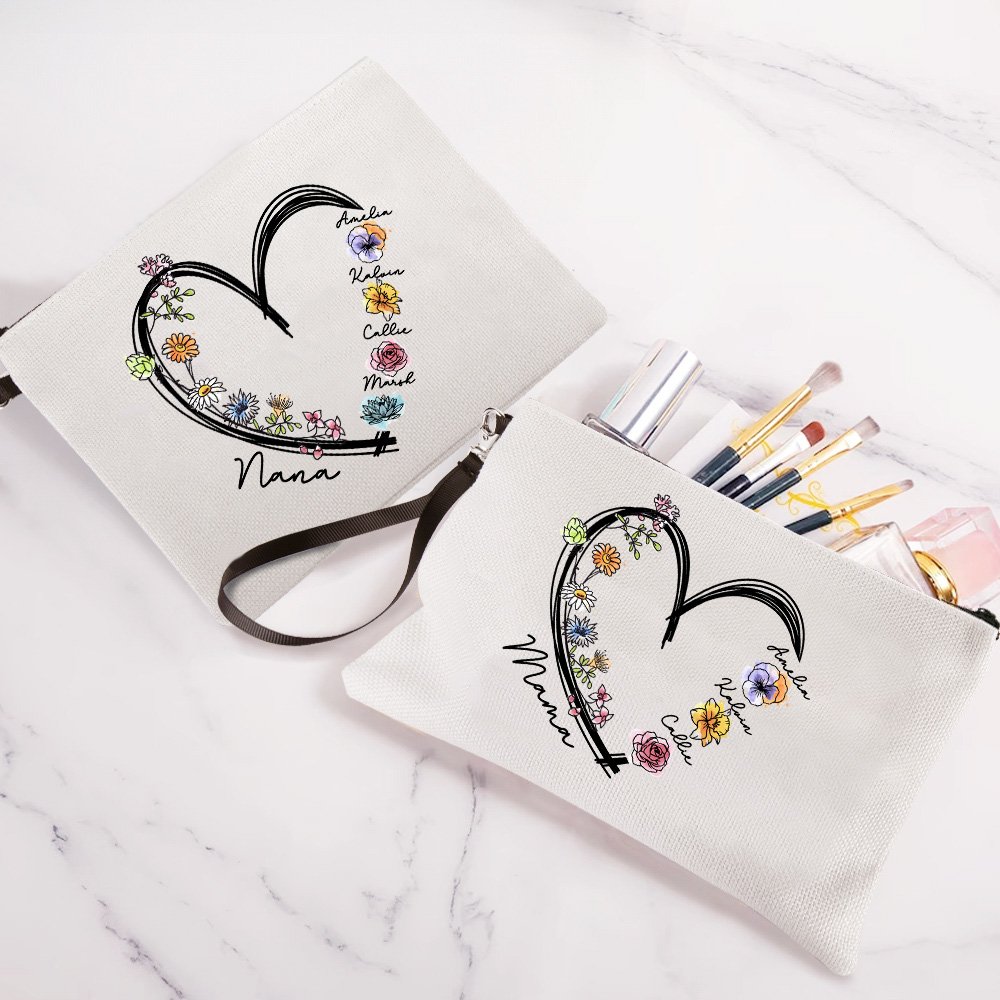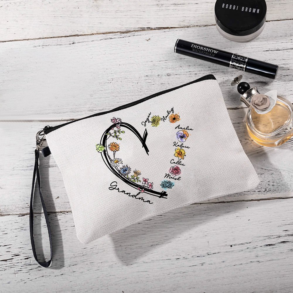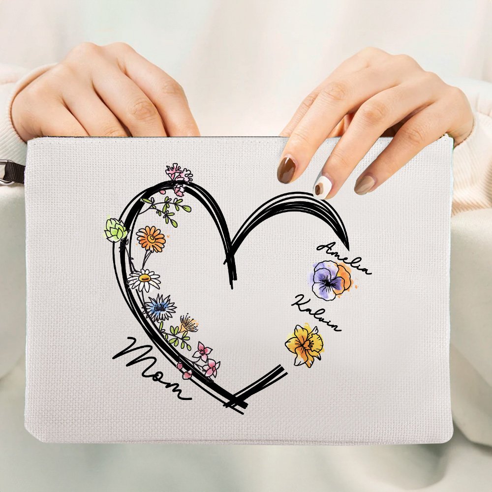 Cette trousse de maquillage se distingue par son design sophistiqué et son allure élégante. Le motif du cœur est astucieusement placé au centre de la trousse, ce qui constitue non seulement une interprétation romantique de l'amour et de la gratitude, mais confère également à cette trousse de maquillage une valeur émotionnelle unique. Elle incorpore également des éléments de fleurs de naissance dans le design de la trousse de maquillage, que vous pouvez choisir en fonction du mois de naissance. Vous pouvez également personnaliser le nom sur la trousse pour la rendre plus personnelle.