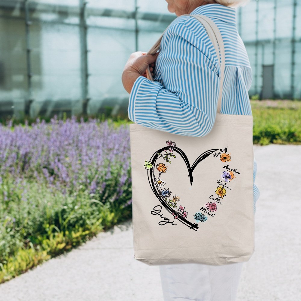 Ce sac fourre-tout se distingue par son design sophistiqué et son apparence élégante. Le motif en forme de cœur est astucieusement placé au centre du fourre-tout, délimité par un cœur d'amour, avec un bouquet fixe à gauche et une fleur de naissance correspondant à chaque personne à droite, chaque fleur symbolisant l'amour et la gratitude. Vous pouvez également ajouter un nom ou un surnom pour ajouter une touche personnelle et créer une pièce unique.