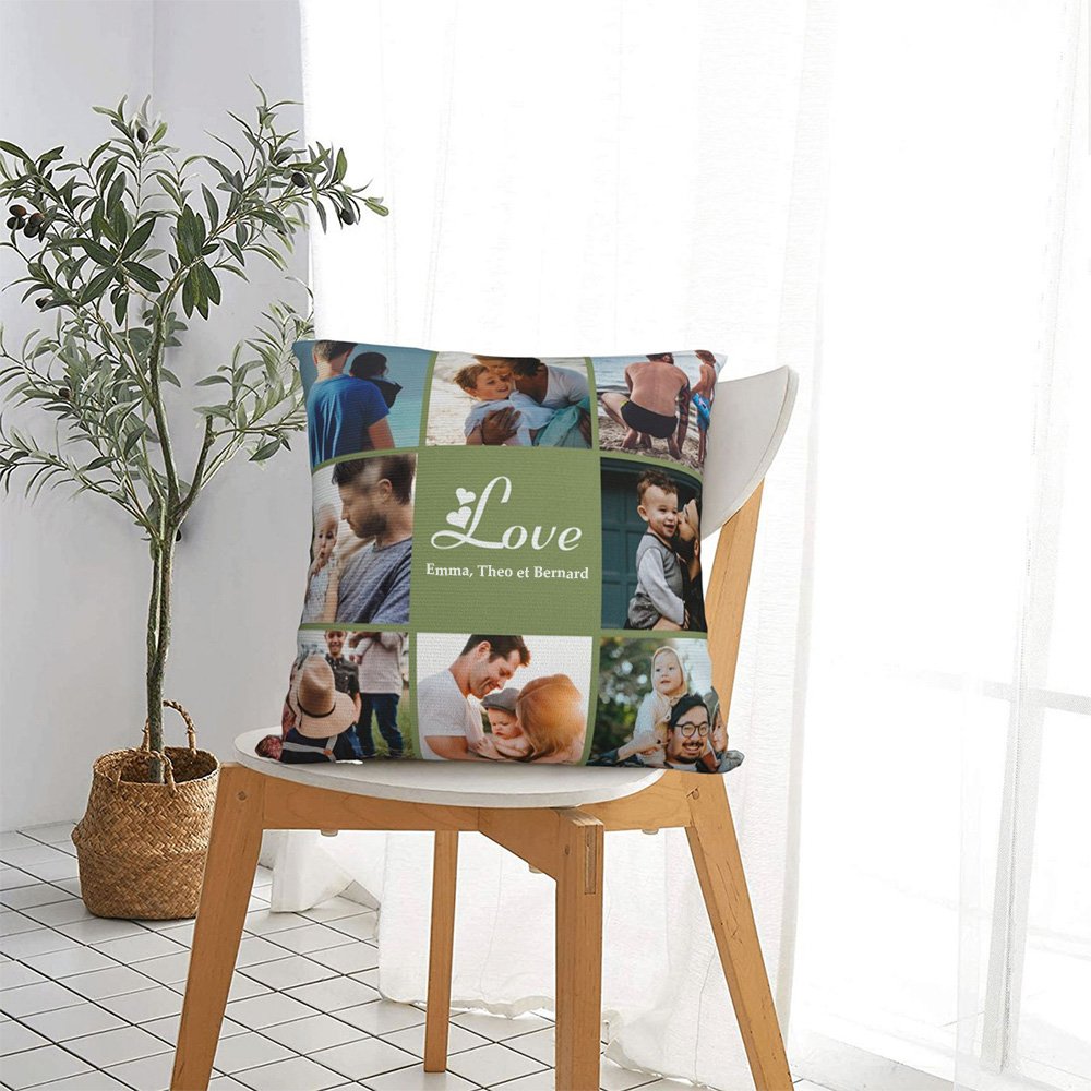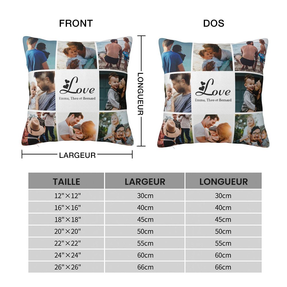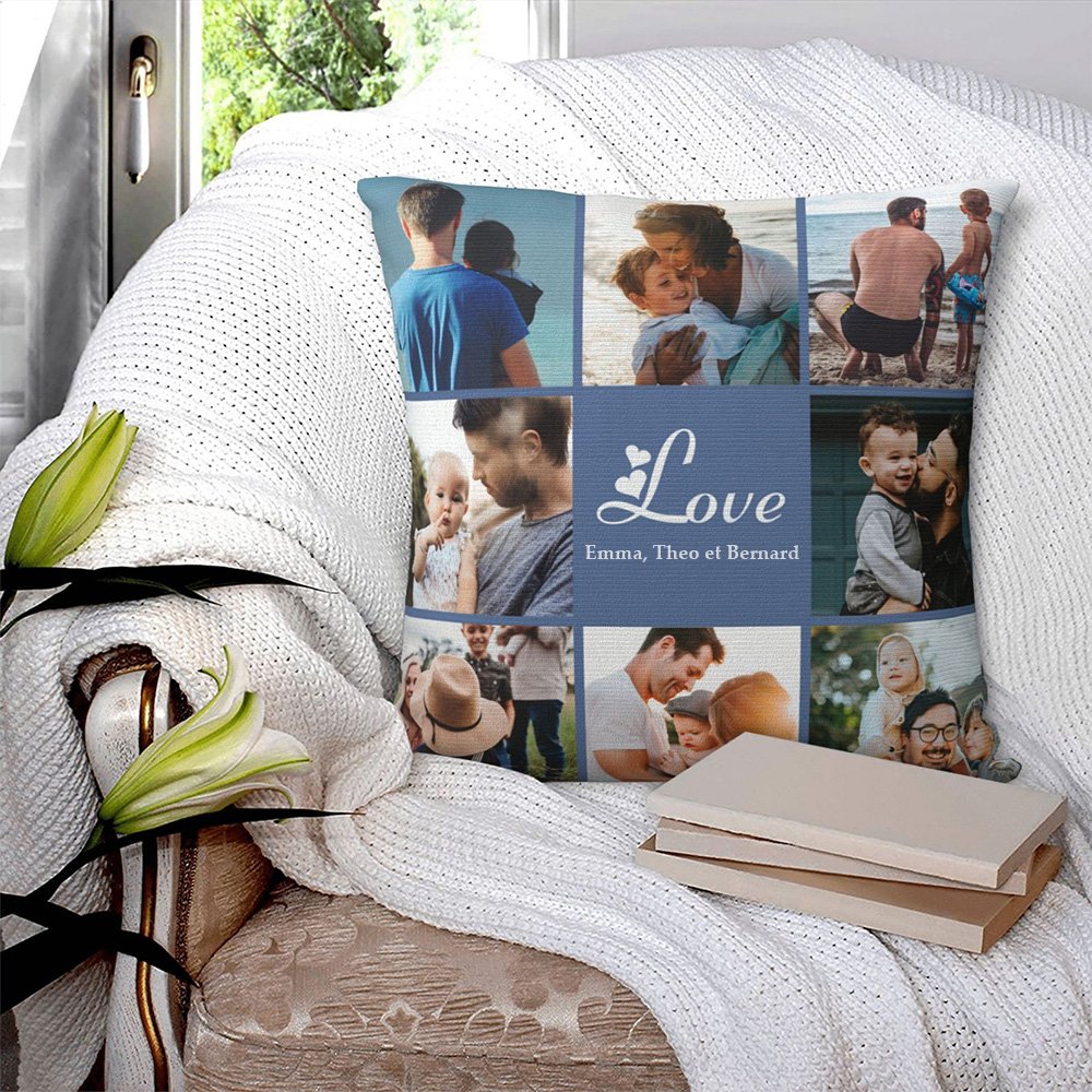Créez un cadeau vraiment spécial et réconfortant pour vos proches avec le coussin de collage de photos d'amour. Combinez leur belle photo et un texte sincère pour exprimer votre amour.