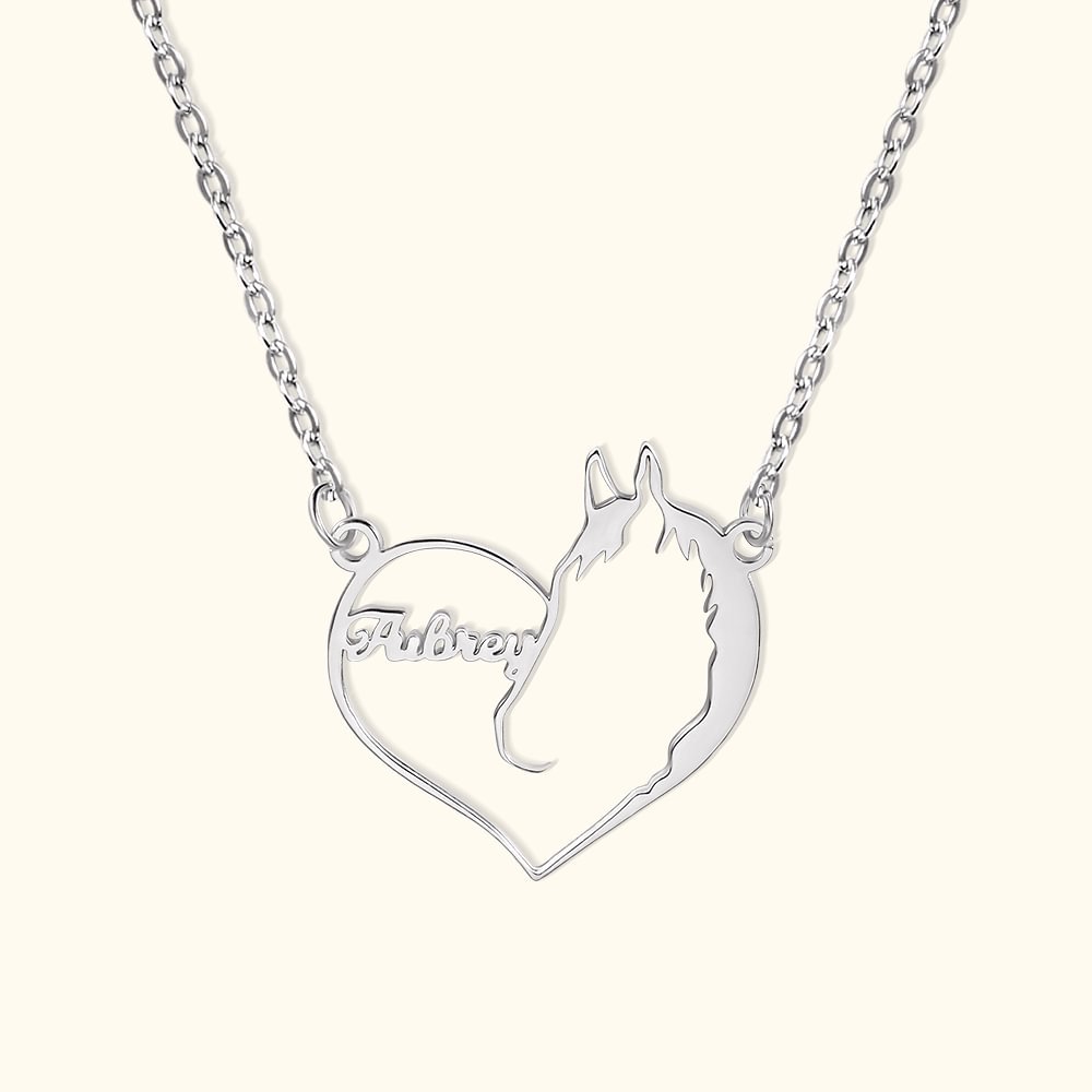 Ce superbe collier comporte un élégant pendentif en forme de cœur sur lequel est gravée la silhouette d'un cheval, d'un chat ou d'un chien.