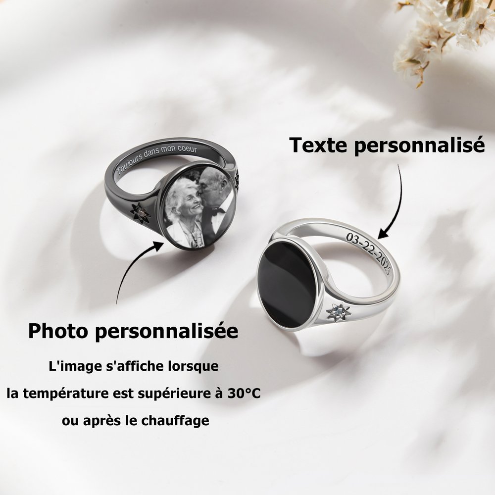 Cette bague est dotée d'une technologie cachée sensible à la température. À température ambiante, elle conserve une apparence élégante et minimaliste, mais lorsqu'elle est réchauffée par la peau ou une source de chaleur douce, une photo personnalisée apparaît lentement à sa surface et s'estompe discrètement lorsqu'elle refroidit. Ce secret interactif transforme les souvenirs les plus chers en un souvenir personnel et vivant. Téléchargez la photo d'un être cher, d'un animal de compagnie ou d'un moment important et associez-la à deux pierres de naissance symboliques et à un texte personnalisé, en associant la mémoire visuelle à la valeur émotionnelle pour créer un accessoire unique.