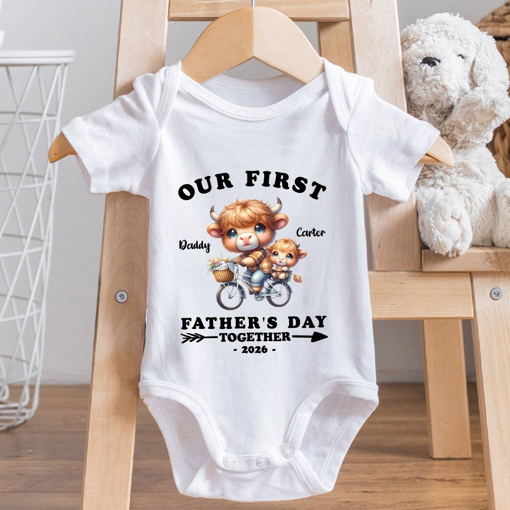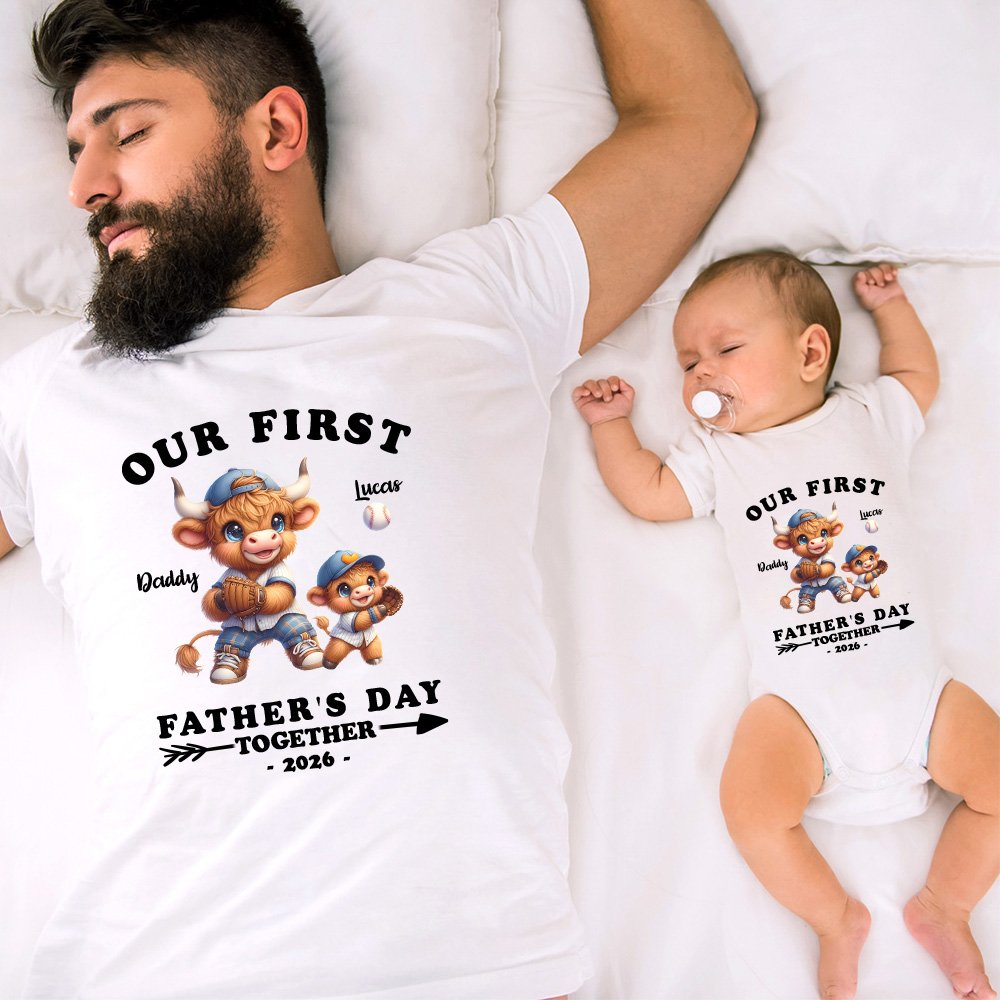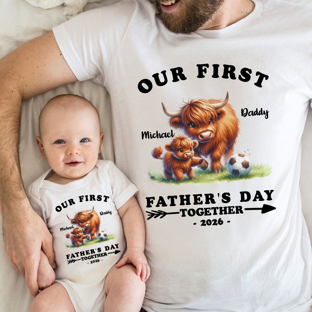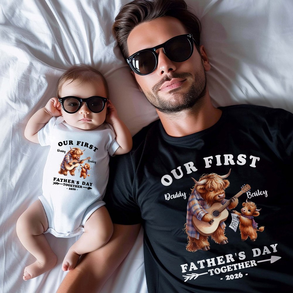 Cet ensemble T-shirt pour papa et grenouillère pour bébé est une façon amusante et tendance de célébrer la première fête des pères d'un nouveau papa. Avec son adorable motif de vache des Highlands et le texte "Our First Father's Day together" (Notre première fête des pères ensemble), il capture la joie et l'amour entre le papa et le bébé.