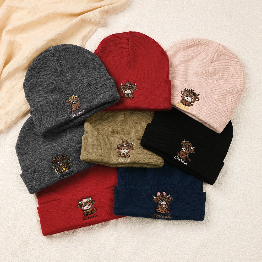 Ce bonnet tricoté s'inspire de l'adorable vache Highland, capturant l'essence du charme rural. Vous pouvez choisir parmi 8 motifs uniques de broderie de la vache Highland et personnaliser le nom de l'enfant, pour que chaque bonnet soit rempli de personnalité et de sentiment. Qu'il s'agisse d'un adorable dessin animé ou d'une image classique de vache des Highlands, les enfants l'adoreront à coup sûr.