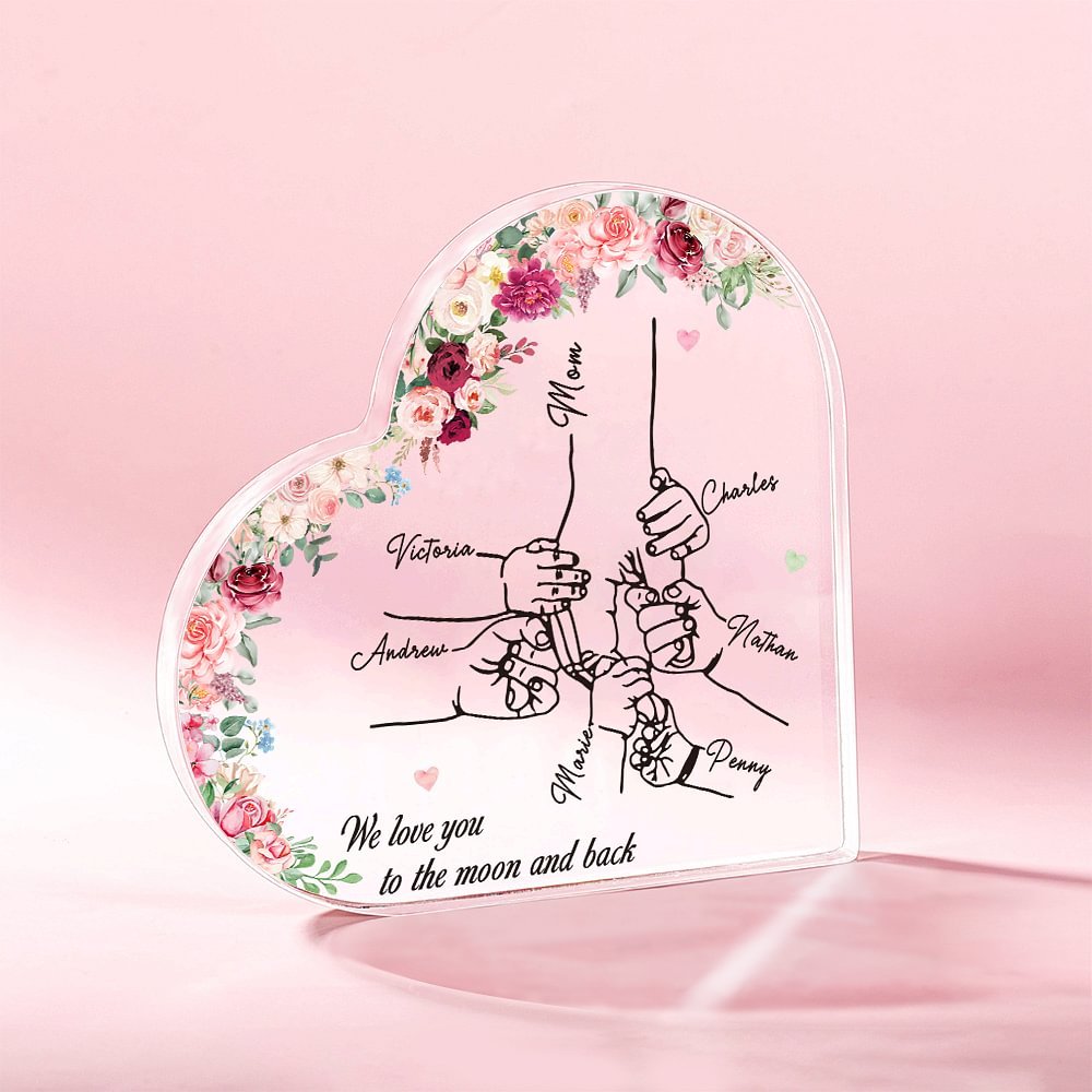 Cette plaque en acrylique a un design unique, la forme générale est un cœur, le haut du cœur est entouré de fleurs, et la plaque est une ligne noire soulignant l'image d'une main qui se tient, simple et belle, vous pouvez choisir le nombre de membres de la famille sur la plaque et ajouter le nom afin que ces lignes entrelacées pour témoigner du lien indivisible entre vous.
