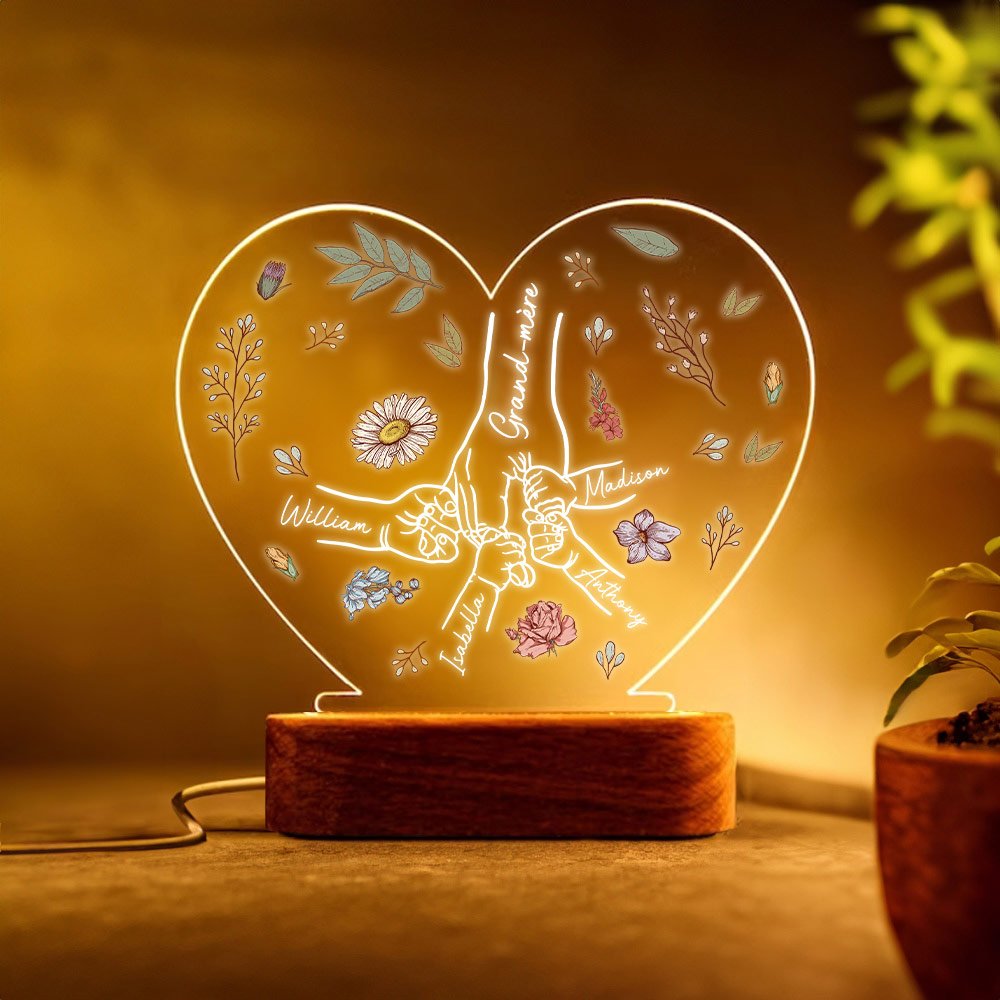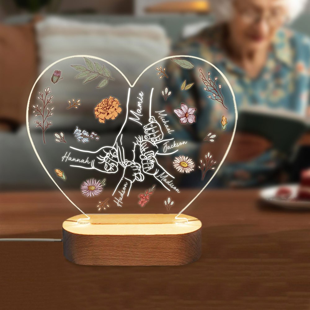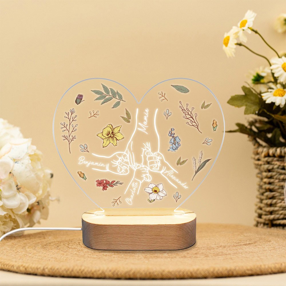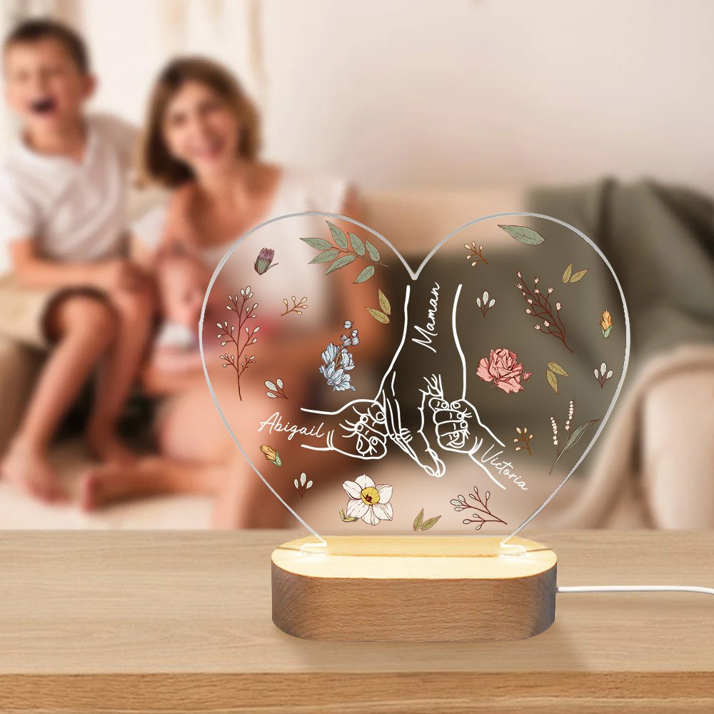 Avec l'image d'une petite main tenant une plus grande, elle symbolise le lien nourricier partagé au sein d'une famille. Cette veilleuse peut être personnalisée avec jusqu'à 6 noms, chacun représenté par une fleur de naissance. Chaque fleur correspond à un mois de naissance, ce qui ajoute à la fois beauté et valeur symbolique au design.