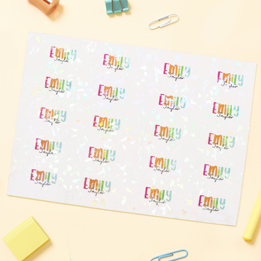 Il associe un style holographique vibrant à la personnalisation. Le design holographique aux couleurs de l'arc-en-ciel ajoute une touche amusante et tendance, tandis que les noms personnalisés rendent chaque autocollant unique. Pour ceux qui aiment les choses colorées et brillantes et qui cherchent à ajouter une touche personnalisée à leurs articles, ce style est très attrayant car il combine l'attrait visuel.
